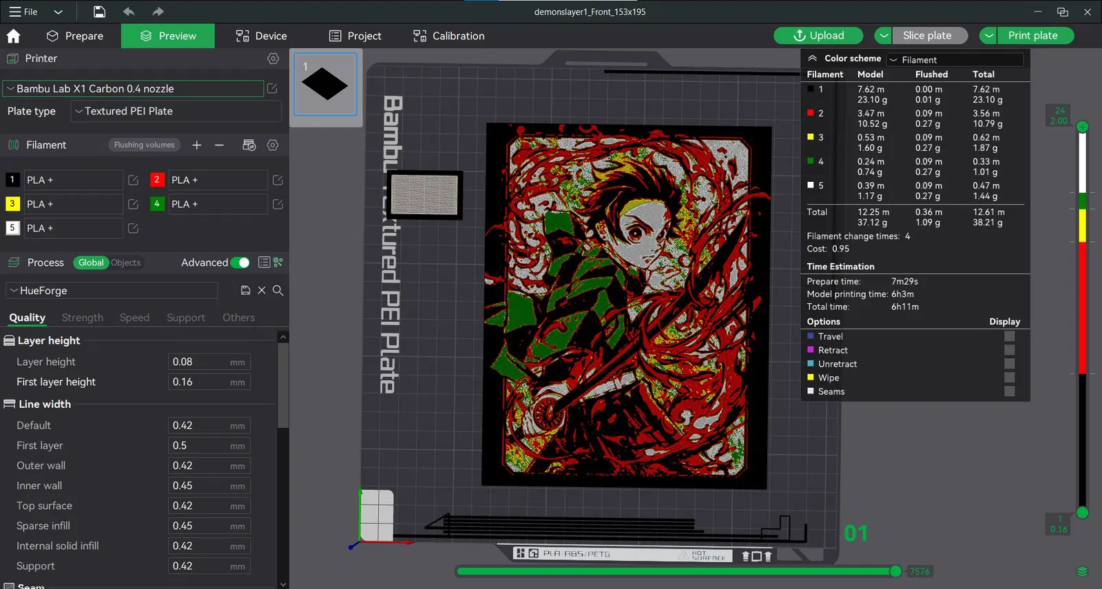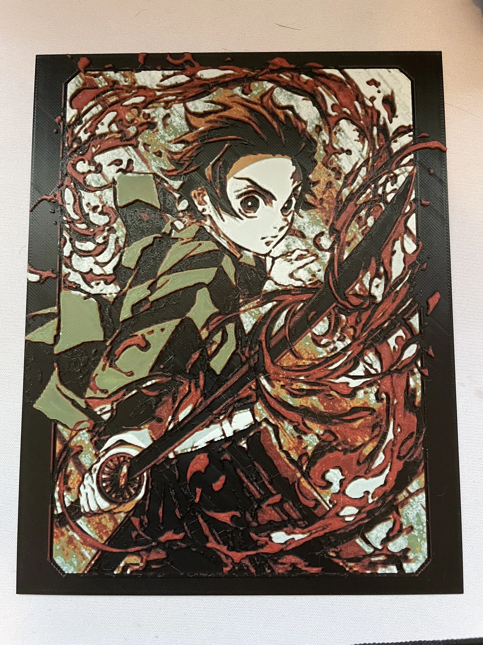 Mô hình Kimetsu no Yaiba Tanjiro theo phong cách tranh 2D Hueforge. Yêu cầu 5 màu filament PLA+ và hướng dẫn chi tiết các lớp thay đổi màu sắc để tạo nên tác phẩm nghệ thuật anime độc đáo.