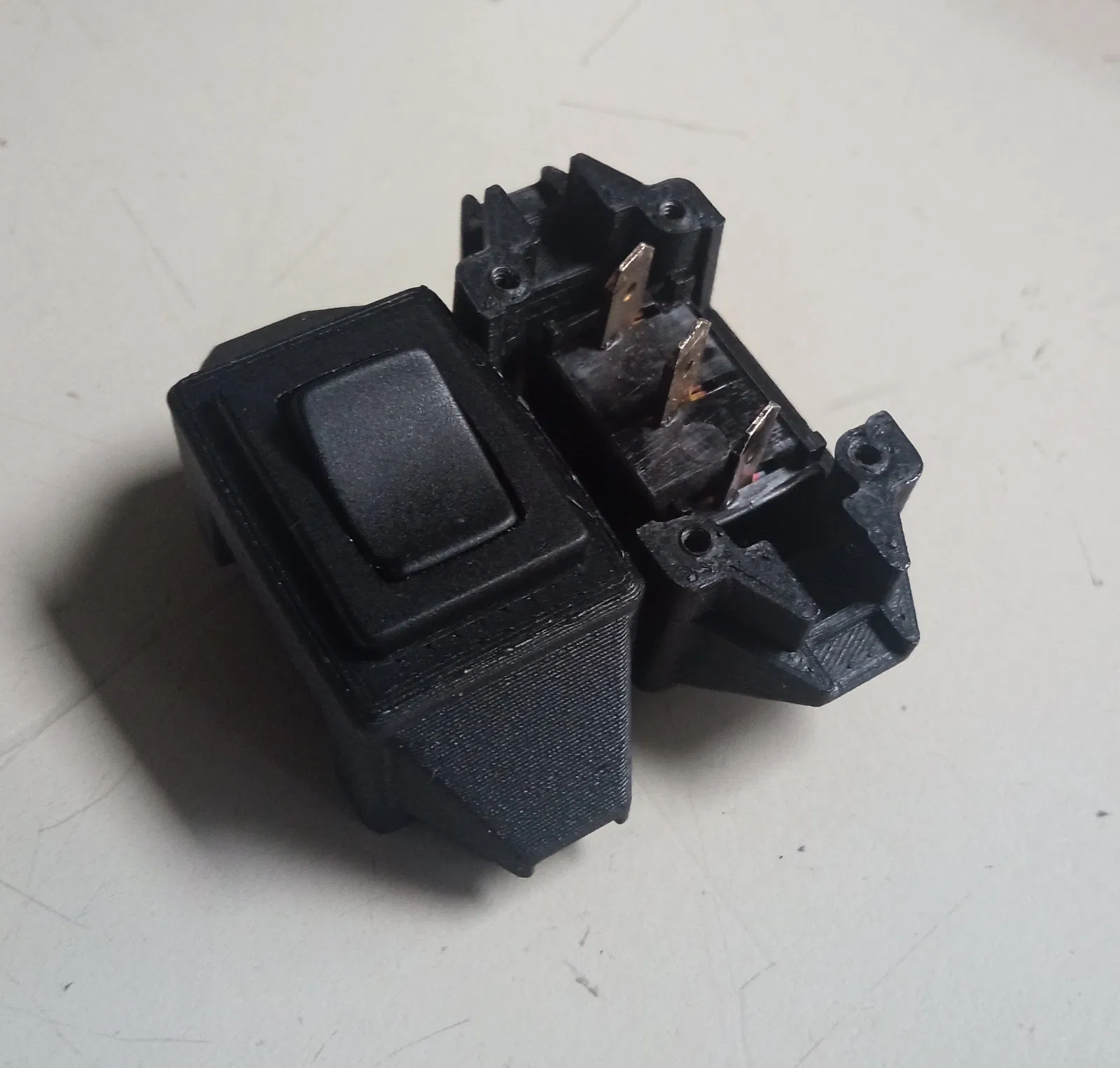 Tôi đã thiết kế cái này để thêm một công tắc gạt vào bộ nguồn DC gắn ngoài nhỏ, nằm trên đường dây từ phía đầu ra. Hai nửa khớp với nhau rất đẹp, và nó cho cảm giác chắc chắn đáng ngạc nhiên ngay cả trước khi bắt vít.