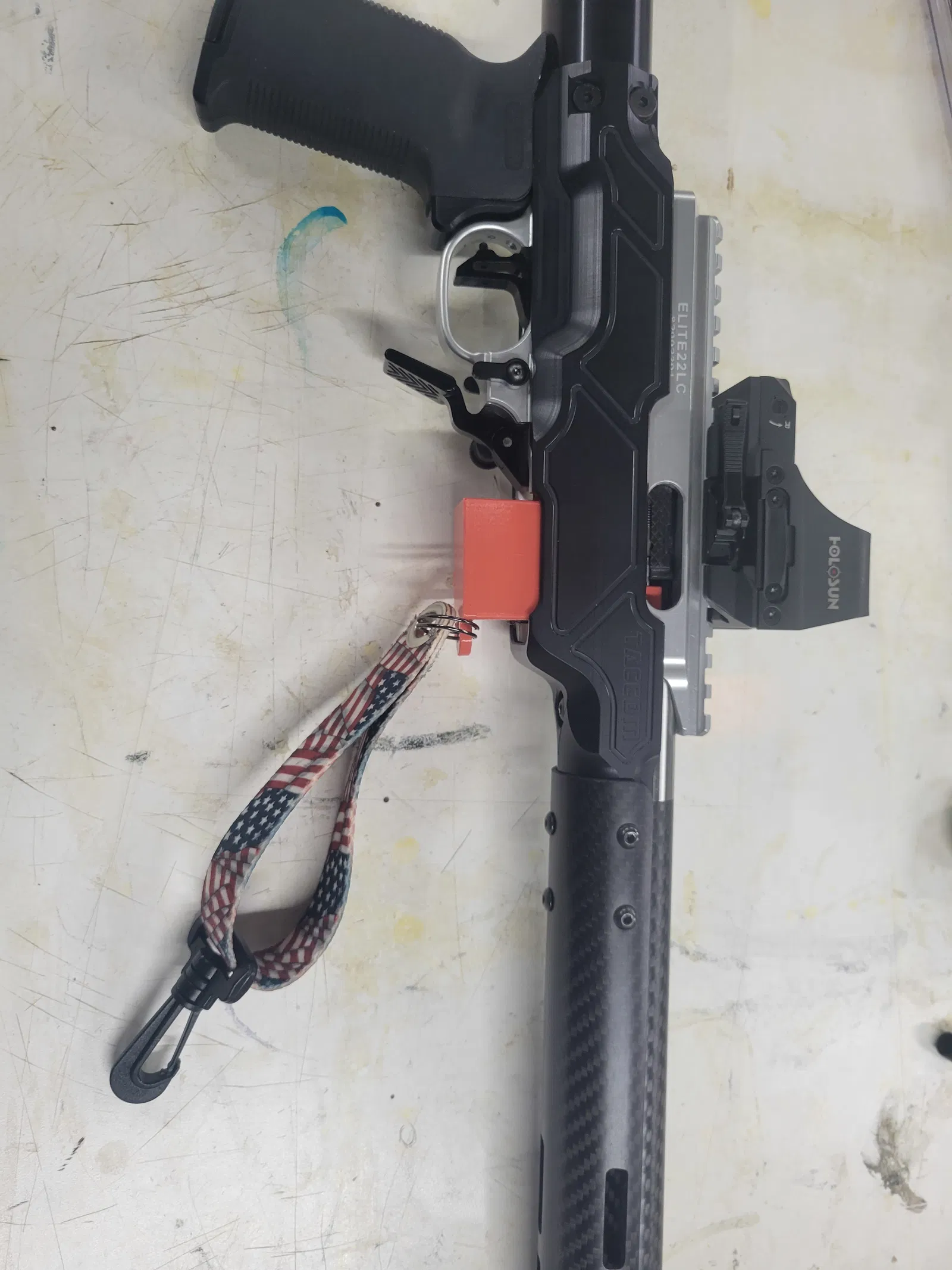 Cái này tui làm cho khẩu Ruger 10/22 của tui nè. Nó nhét vô cái chỗ gắn băng đạn á, rồi nó khóa lại y chang băng đạn bình thường, mà nó giữ cho cái bolt nó mở luôn. Kiểu cờ báo buồng súng (chamber flag) này hơi khác ha.