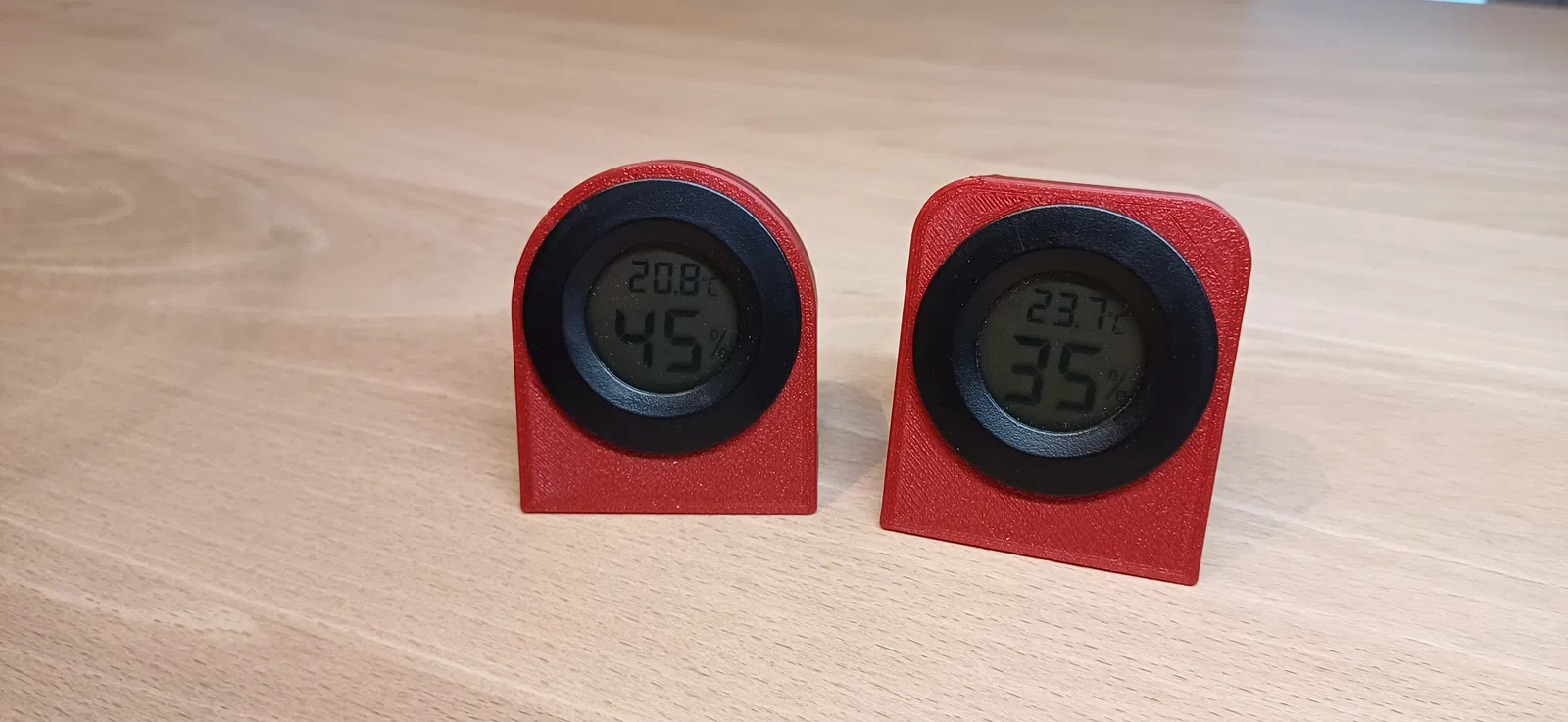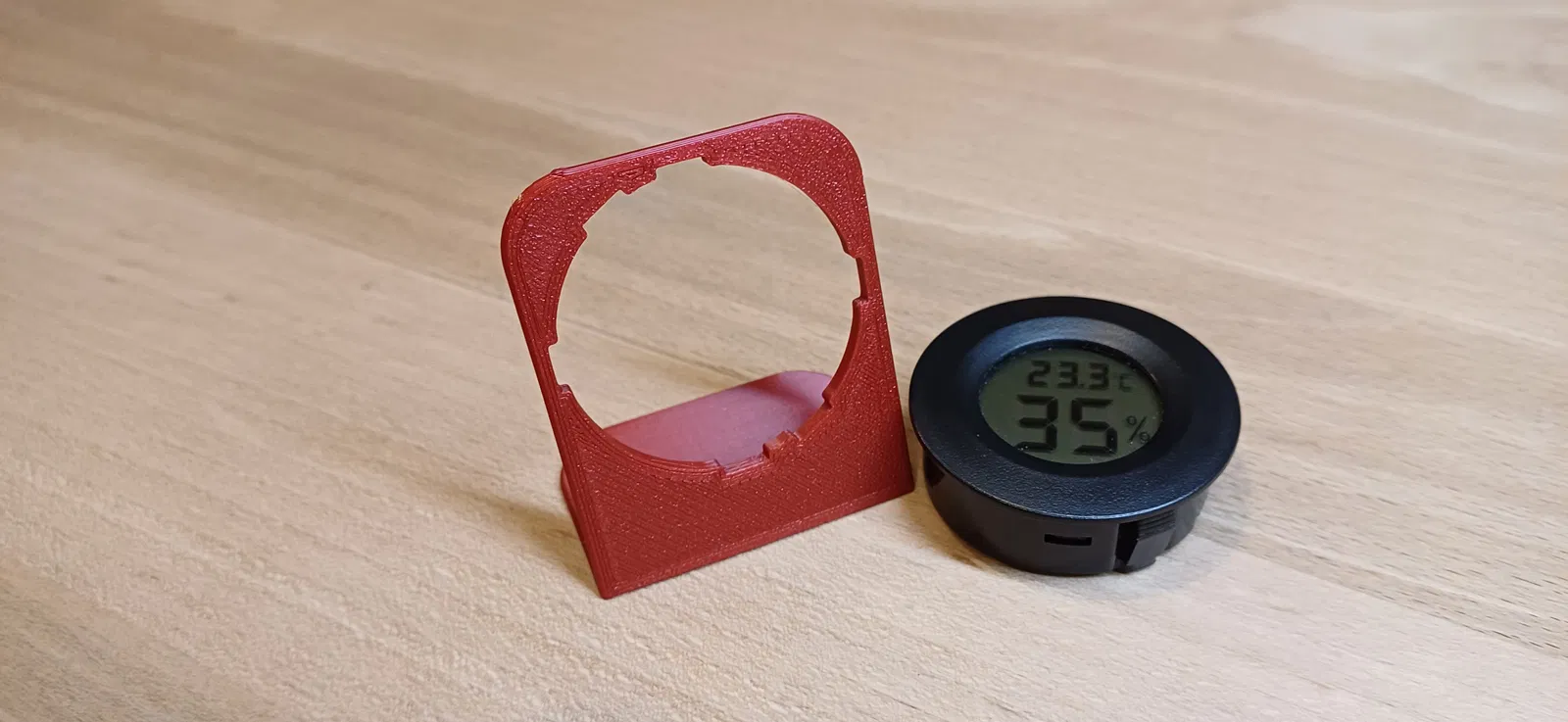 Chân đế "khủng" và "mảnh mai" cho nhiệt kế/ẩm kế tròn 44 mm, đặt trên bàn hoặc bề mặt phẳng. Có các tùy chọn in không cần support, bản dày/mỏng và bản nghiêng 45°.