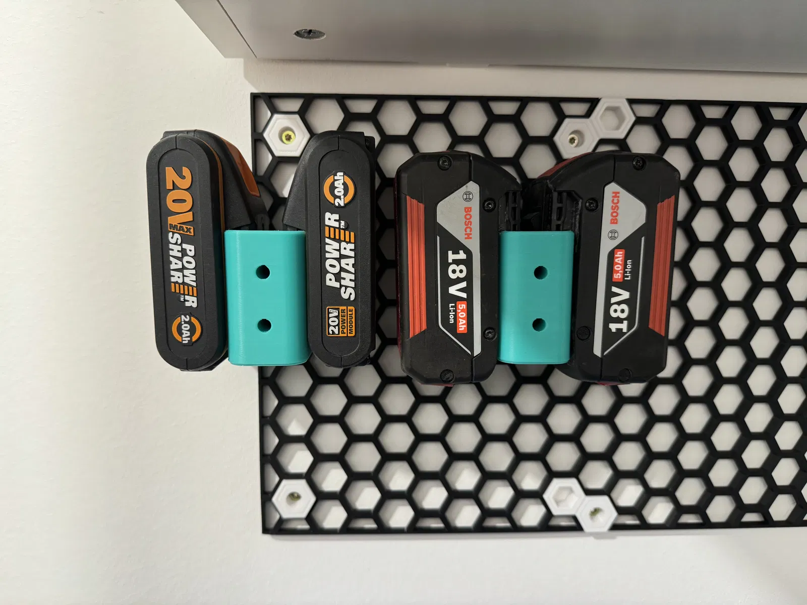 Cất giữ pin Bosch 18V của bạn trên HSW. Giá đỡ này giúp bạn sắp xếp pin gọn gàng, dễ dàng tìm thấy khi cần. Lắp đặt đơn giản chỉ với 2 con ốc M3x12 và đai ốc M3.