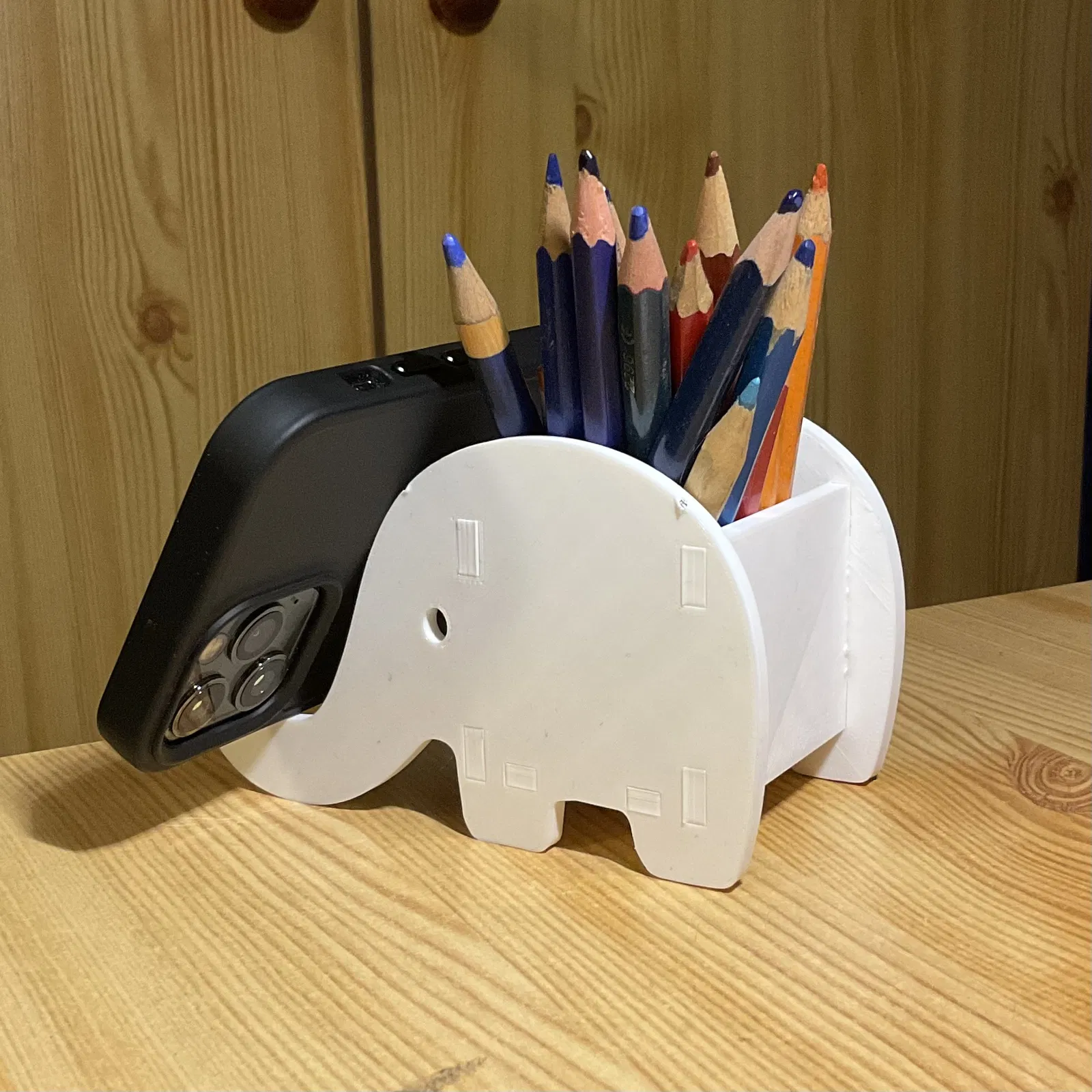 Chân đế/hộp đựng bút hình con voi dễ thương. Đừng ngại dùng lực nếu các bộ phận không khớp, và hãy dùng keo để cố định nếu cần. Sản phẩm này là phụ kiện trang trí độc đáo cho bàn làm việc của bạn.