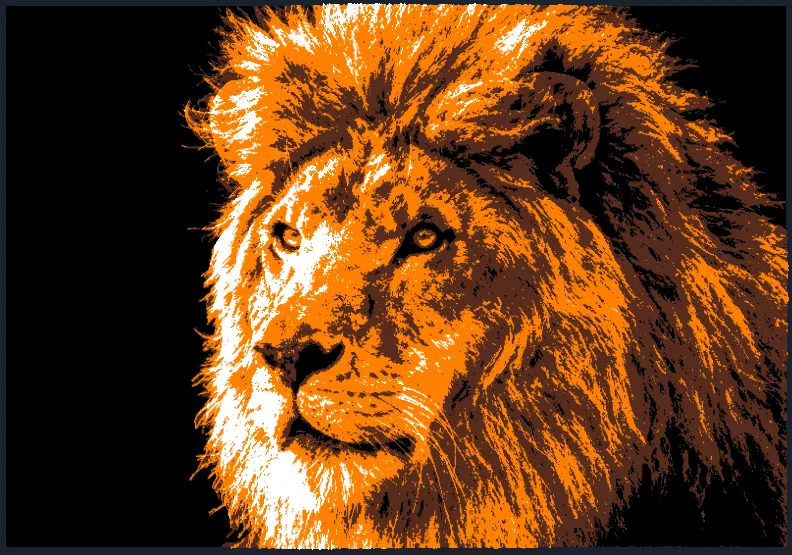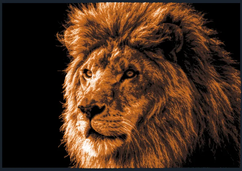 Một bức tranh đầu sư tử rất đẹp, kích thước 160x110mm. Hướng dẫn chi tiết về cài đặt in và màu sắc, bao gồm độ cao lớp, độ dày viền, và các điểm chuyển màu từ đen, nâu, cam đến trắng. Hoàn hảo cho người dùng HueForge.