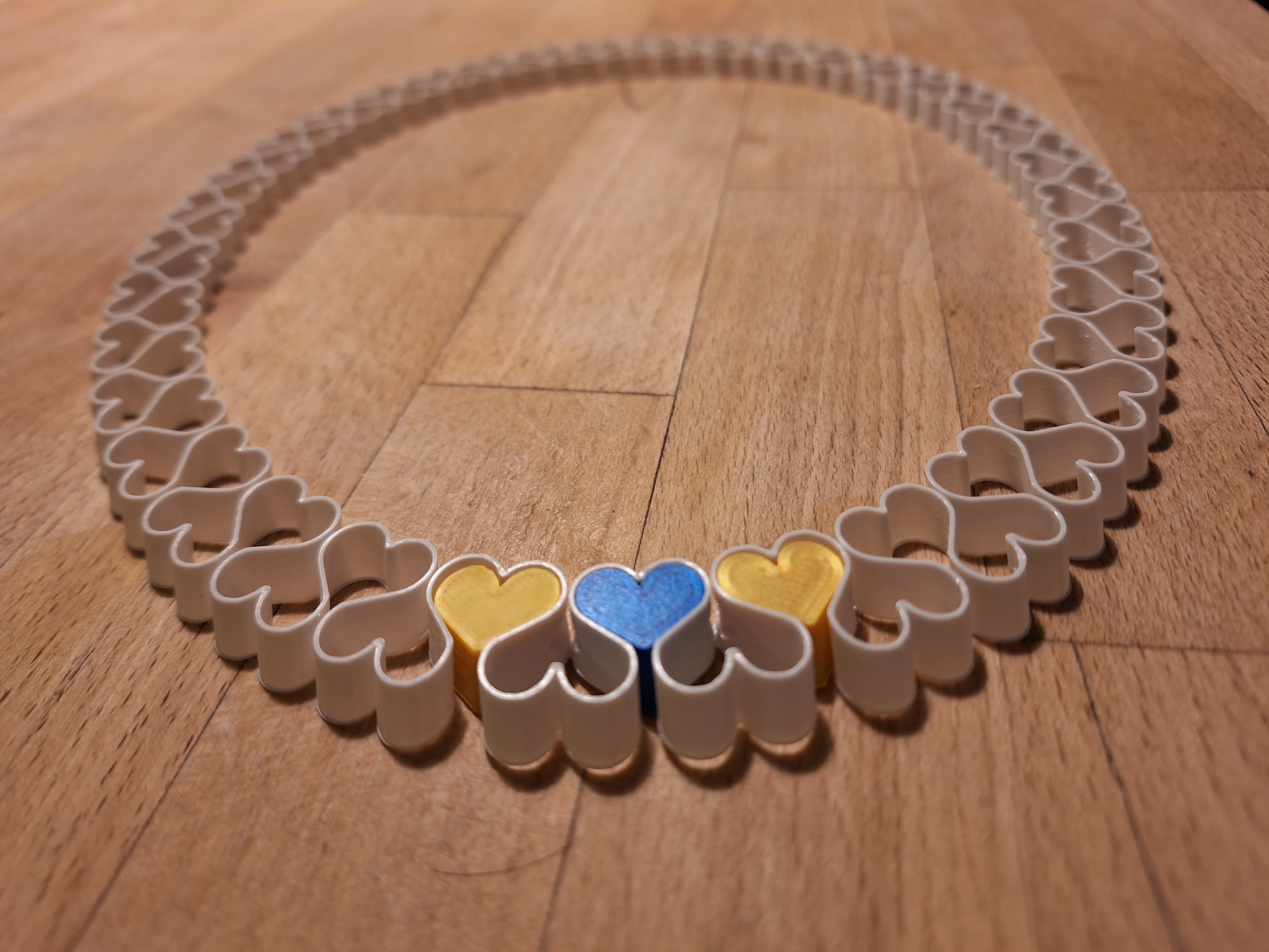 Một chiếc dây chuyền với nhiều trái tim nhỏ xinh, được in theo chế độ "Vase Mode". Bạn có thể thêm ba trái tim đặc ở phía trước để tạo điểm nhấn màu sắc, phù hợp với chất liệu PETG hoặc ASA.