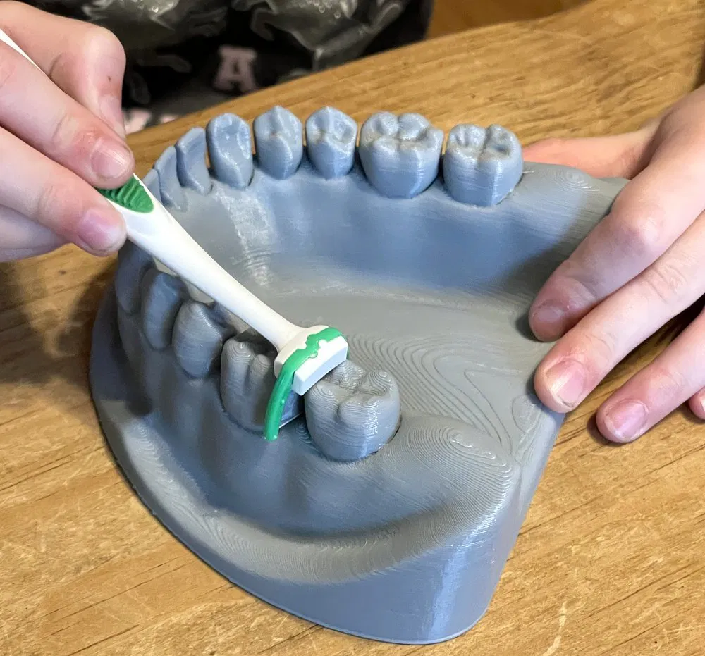 Mô hình này dùng để dạy cách chải răng, dùng chỉ nha khoa và máy tăm nước. Các khe hở giữa răng giúp trình diễn dùng chỉ nha khoa dễ dàng. Mẫu in lớn hơn bình thường để dễ nhìn.