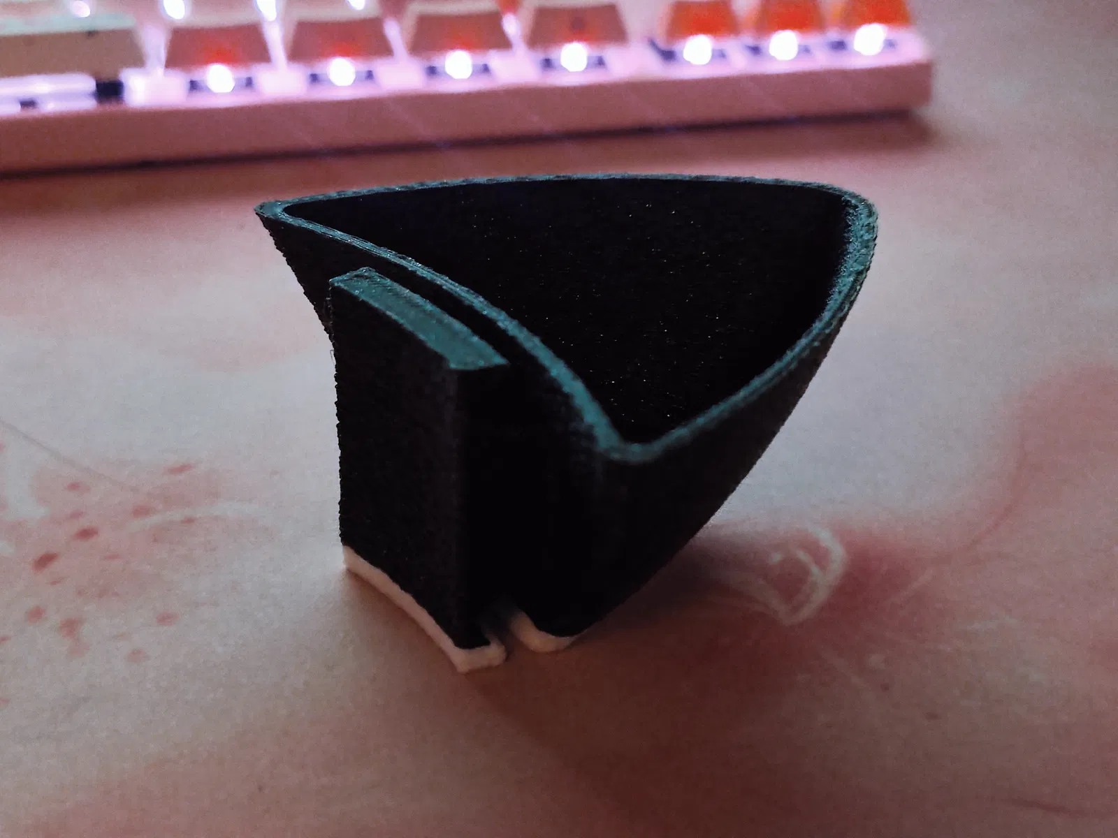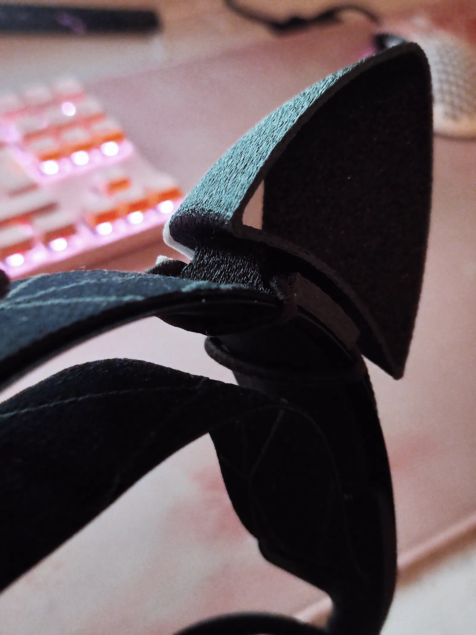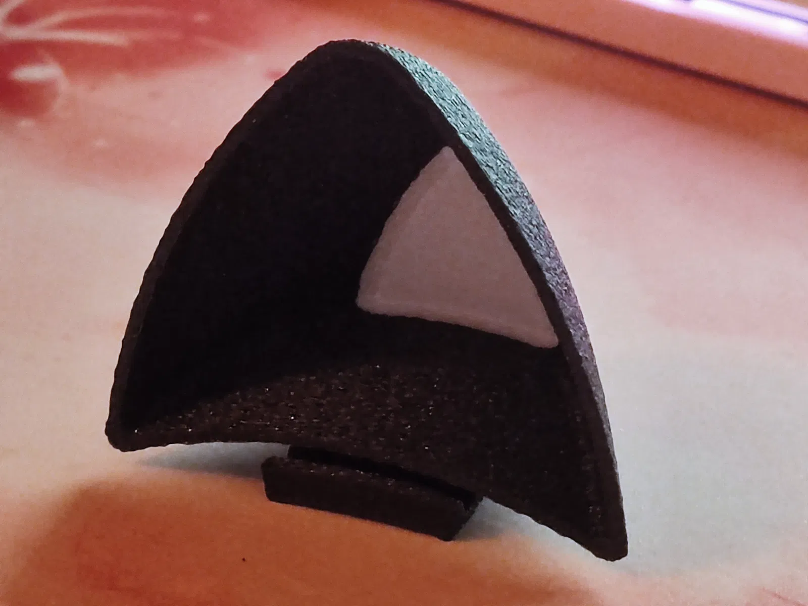 Nên tui tự thiết kế cái khác để cải thiện nó. Theo tui thấy, cái này hay hơn là vì nó in được nguyên khối nên bền hơn. Một vấn đề khác mà tui gặp với cái tai mèo hồi nãy là dây thun hay bị tuột ra vì tai nghe của tui (Arctis 7) nó hơi bị rộng.
