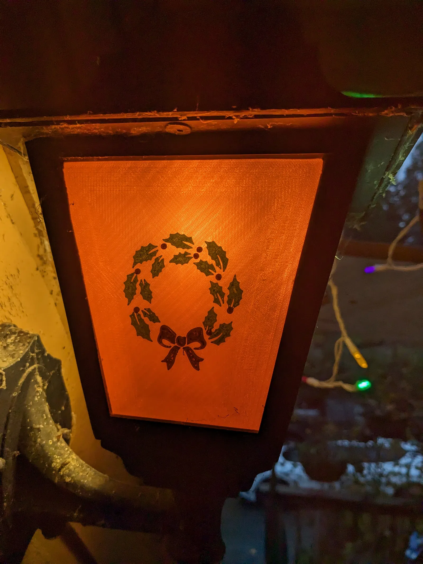 File .3mf bao gồm hai hình dạng - một là tấm kính mờ, và một là vòng nguyệt quế ngày lễ. Nếu đèn hiên nhà bạn cần cao hơn/thấp hơn/rộng hơn, hãy thay đổi kích thước tấm kính mờ và reslice - hình dạng sẽ không bị ảnh hưởng.