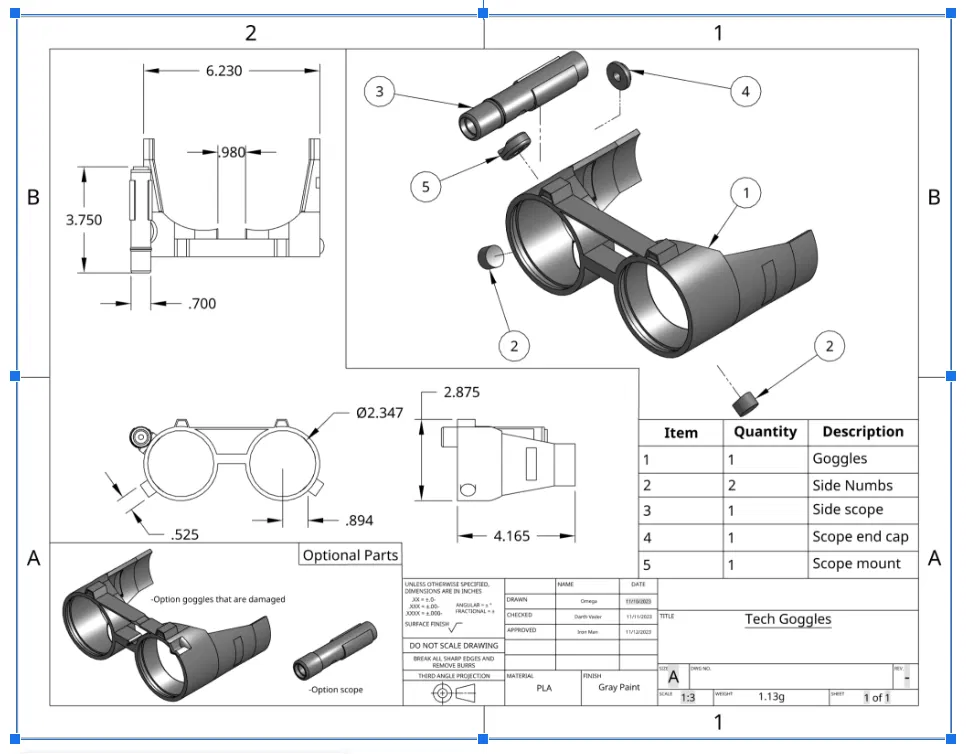 Bộ kính cosplay Tech từ Bad Batch, có cả phiên bản thường và phiên bản hư hỏng. Thiết kế tỉ mỉ giống phim, có tùy chọn ống ngắm/đèn. Hướng dẫn lắp ráp chi tiết, có thể gắn thêm LED và dây đeo. Thích hợp cho người yêu thích Star Wars và cosplay.