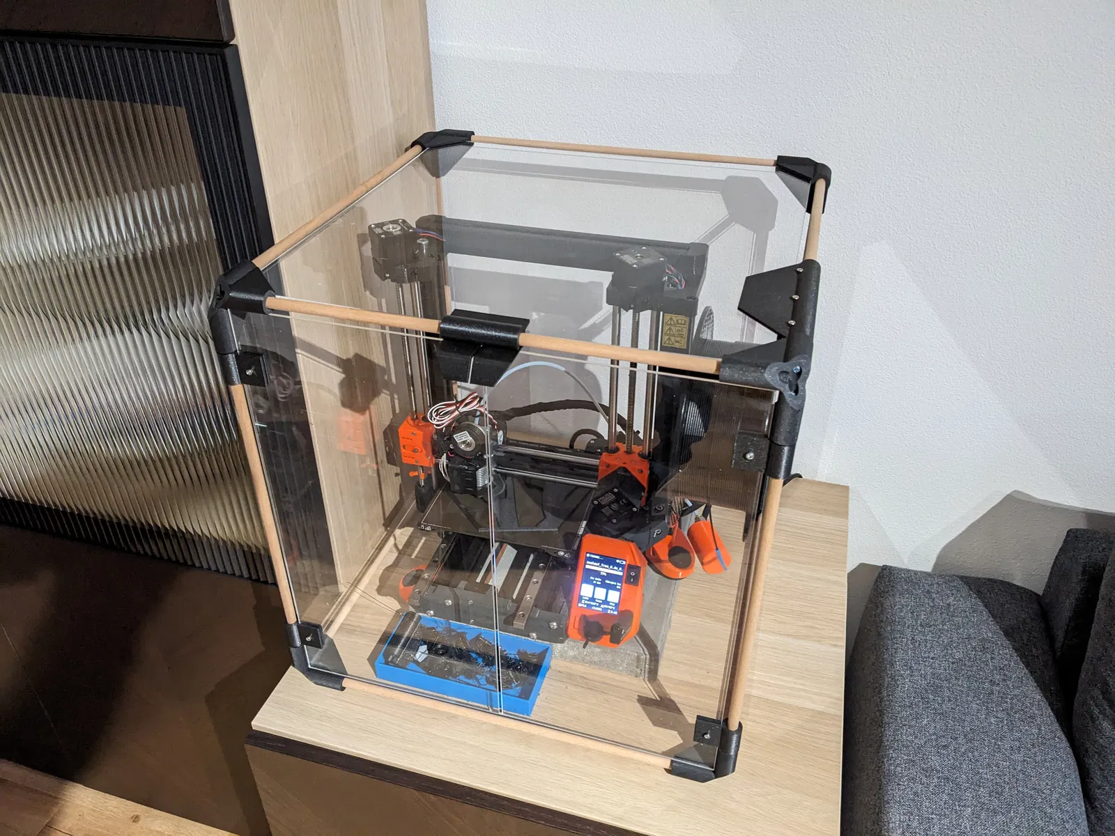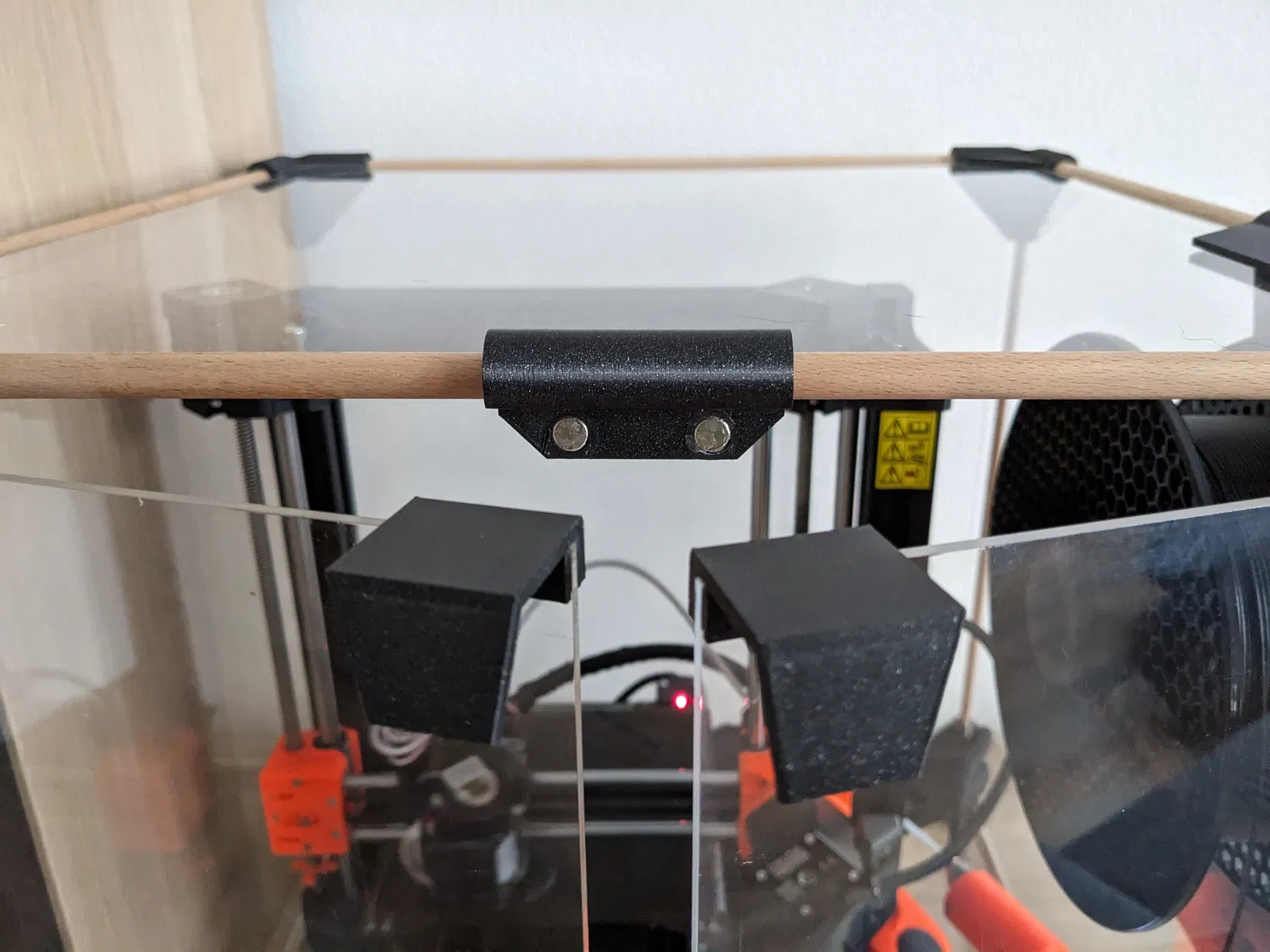 Kích thước của hộp chỉ bị giới hạn bởi kích thước của các thanh nối và các tấm che. Thanh tròn Ø10mm, gỗ hay kim loại, tùy bạn chọn. Tôi đã dùng thanh gỗ sồi. Các tấm che dày 3mm, vật liệu cũng tùy bạn. Tôi đã dùng tấm plexiglass có sẵn từ hộp IKAE lack Pruša cũ, chỉ cần mua thêm một tấm nữa là đủ. Vật liệu tôi đã dùng: 12x thanh gỗ sồi Ø10 mm, dài 420 mm 24x vít tự khoan để nối các góc 4x vít M3x10 cho cửa 3x vít M3x14 cho giá đỡ cuộn dây 3x đai ốc M3 cho giá đỡ cuộn dây Plexiglass 4x 440x440x3 mm Plexiglass 2x 440x220x3 mm 2x nam châm 8x3 mm (tại hết loại khác rồi :)) 2x nam châm 20x6x2 mm
