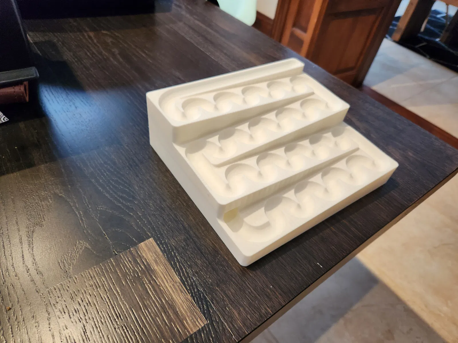 Đây là một cái bàn đường chạy bi mà tui đã thiết kế và in cho thằng nhóc 2 tuổi nhà tui hồi Giáng sinh năm nay, dựa trên mấy cái video YouTube mà nó hay coi có nhiều thứ giống vầy nè. Mấy viên bi sẽ chạy xuống theo đường đi và gom lại trong một cái khoang ở dưới cái mê cung, có cái lỗ để lấy ra ở phía sau. Cái này tui thiết kế để chạy với bi 0.6 inch nha... Link Amazon ở đây. Cái đường đi có đường kính 0.75 inch, nên bi cỡ khác cũng chạy được ha.