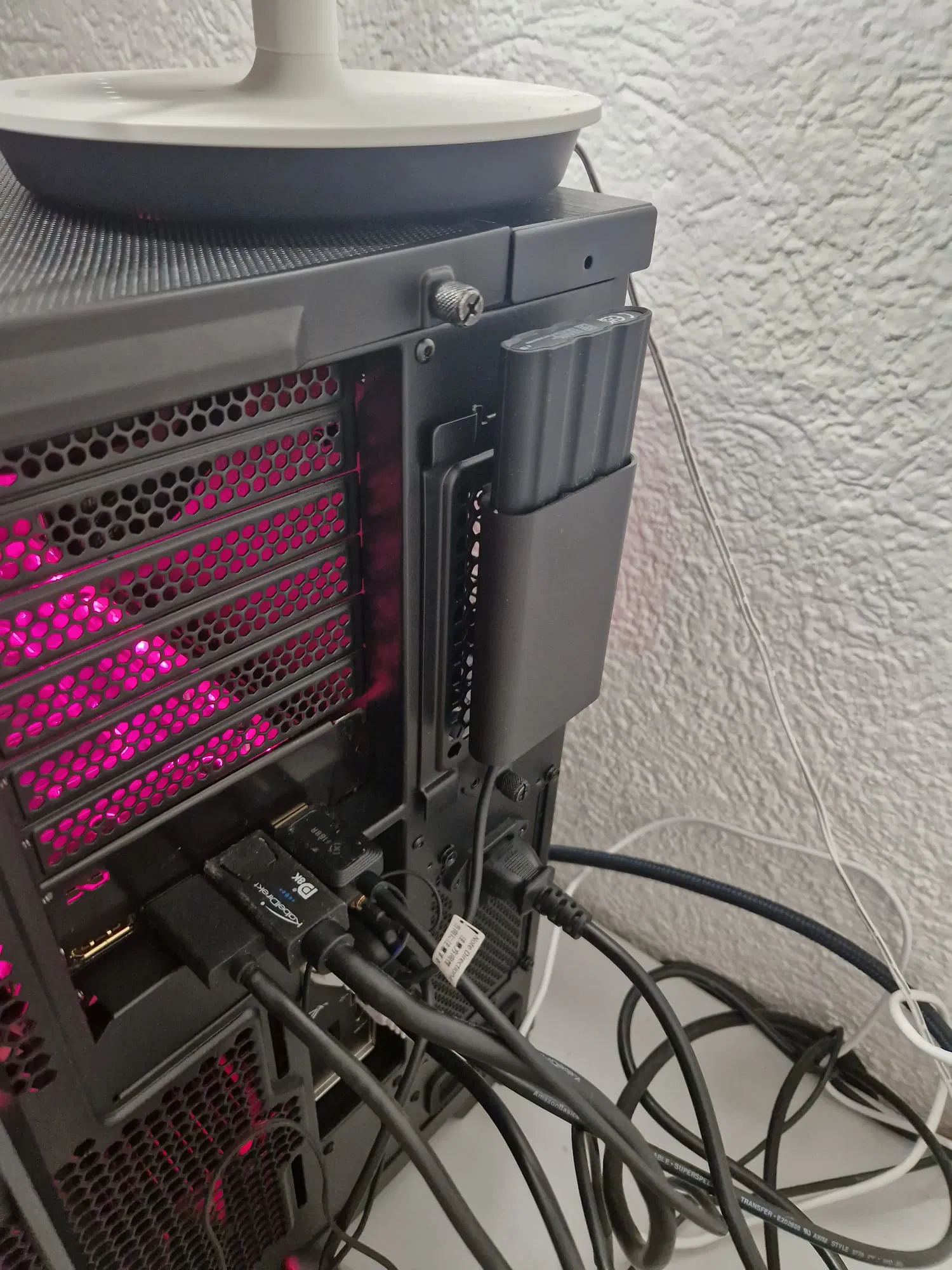 Nó gắn vào Lưới Lục Giác ở phía sau. Tôi đã gắn nó vào nắp khay ổ cứng có thể tháo rời, nhưng tôi khá chắc là nó vừa với mọi nơi. Nó được thiết kế để hoạt động với cáp USB Type C đi kèm.