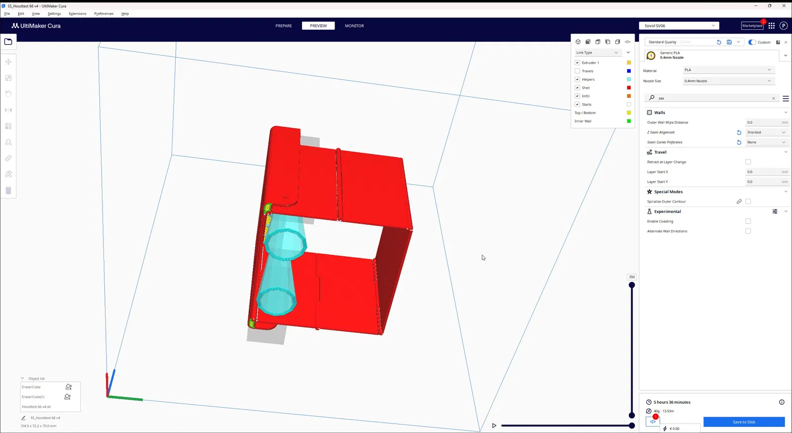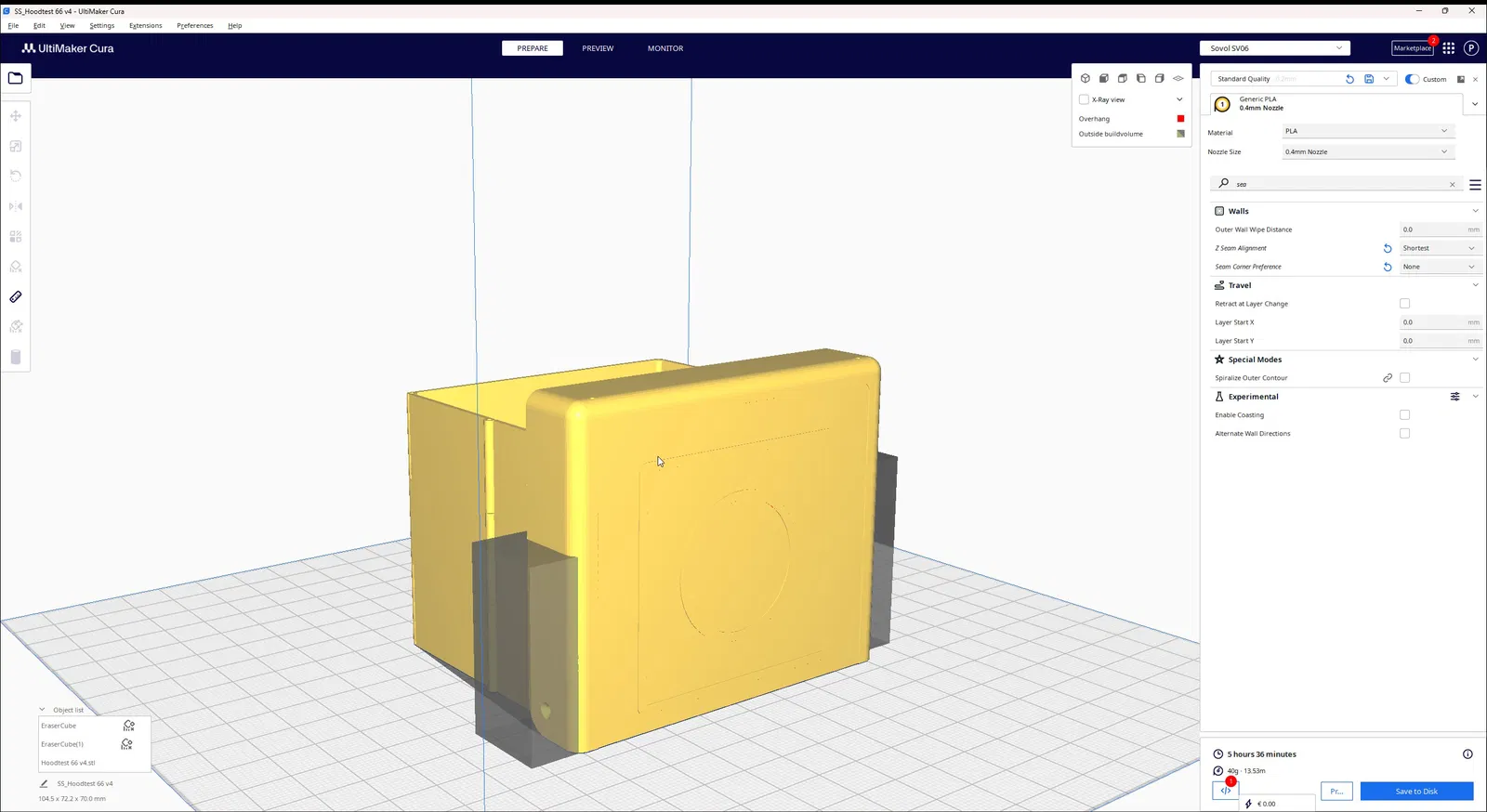 Đây là bản thử nghiệm thứ ba. Đang cố gắng tạo ra một cái mũ trùm có thể gập lại được in trực tiếp. Ý tưởng là lấy vật thể ra khỏi bàn in sau khi kéo các trục của bản lề.
