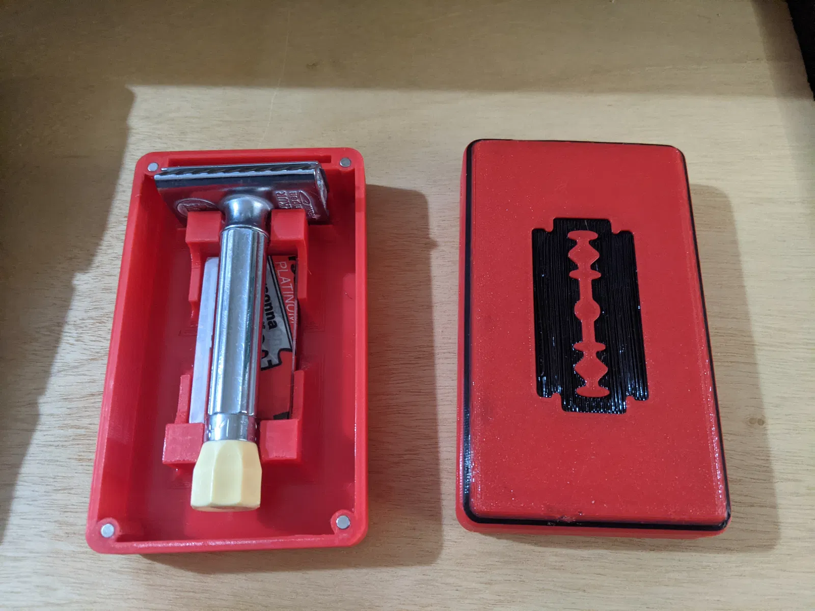 Hộp đựng du lịch cho dao cạo râu an toàn Merkur Progress, có chỗ chứa lưỡi dao dự phòng. Hộp đóng mở bằng nam châm (3x3mm hoặc 3x2mm tùy chọn) và có sẵn tệp Fusion 360, STEP để bạn tùy chỉnh theo ý thích.