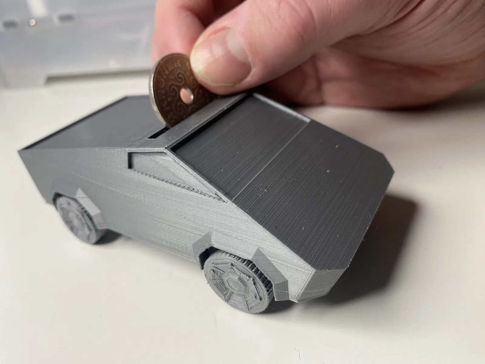 Niềm vui bắt đầu khi bạn bắt đầu "cho" chiếc Cybertruck mini của mình ăn tiền xu. Khe cắm phía trên trở thành lối vào cho cuộc phiêu lưu tiền lẻ của bạn. Tiếng lách cách của tiền xu va vào bên trong mang đến một chiều âm thanh thỏa mãn cho trải nghiệm, khiến việc tiết kiệm tiền trở nên thích thú.