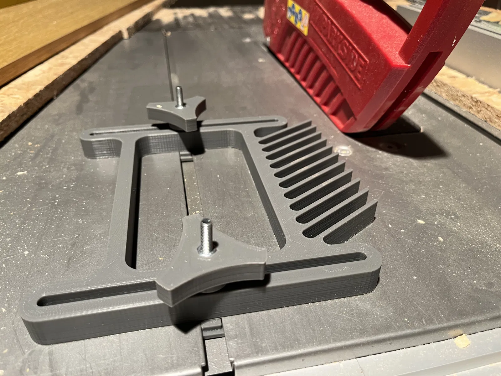 Tìm hoài không có món nào xài hợp với máy cưa bàn Parkside PTK 2000 E3, nên mình tự thiết kế cái featherboard này. Nó có thể xài với máy có ray dẫn hướng tương tự. Cần 2 ốc M5x40, 2 đai ốc và 2 long đền M5 lớn. Nhớ xem kỹ hướng dẫn an toàn nha!