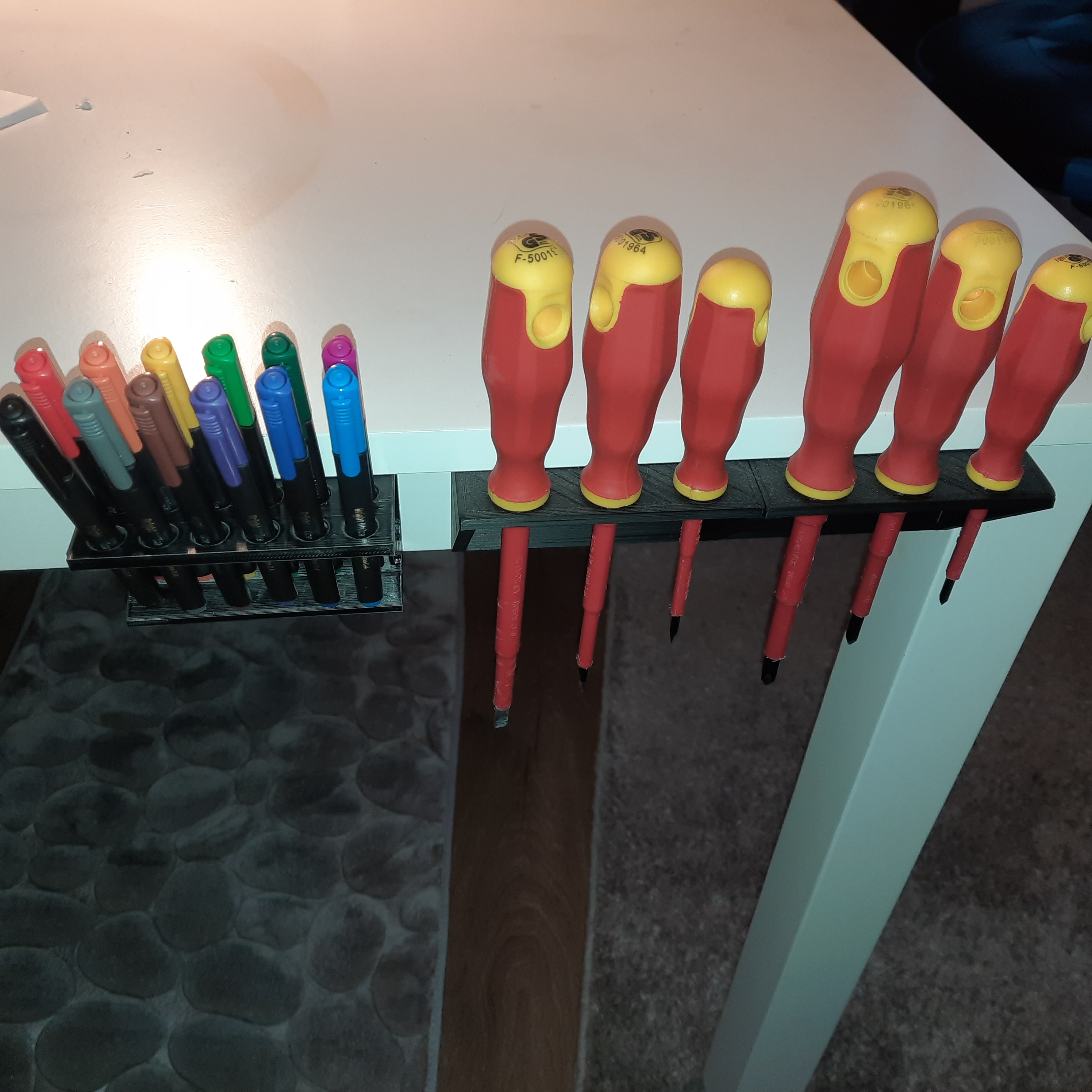 Giá đỡ bút chì và giá đỡ tuốc nơ vít có thể dễ dàng gắn vào cạnh bàn của bạn bằng ốc vít để giữ cho bàn làm việc của bạn ngăn nắp hơn. Của tôi được in bằng PLA và giá đỡ bút chì được in màu trắng nhưng đã được sơn xịt màu đen để thử nghiệm.