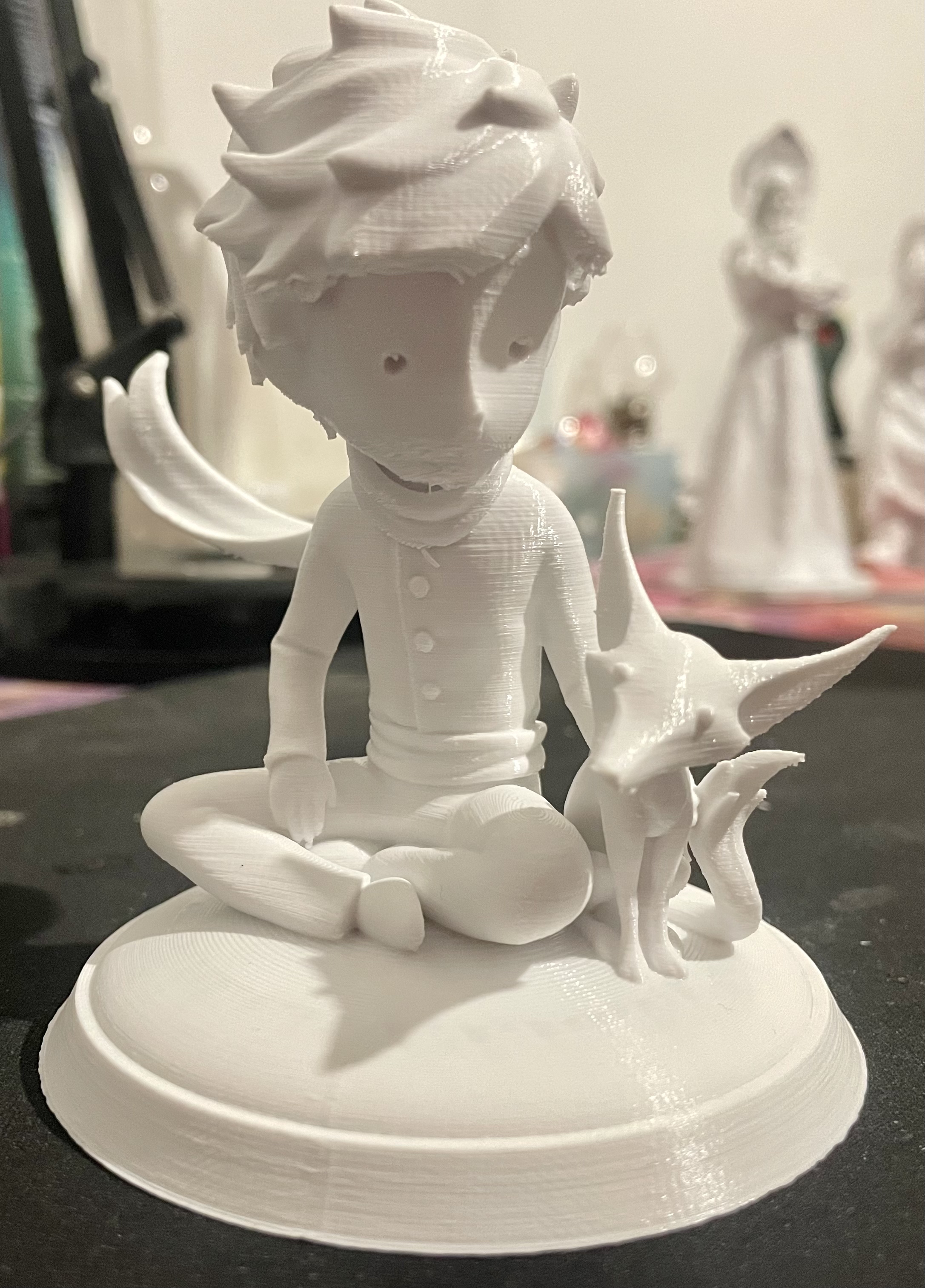 Tự tay tạo các support cho phần khăn choàng nha. Mấy cái khác thì dùng tree support trong CURA là được rồi. À mà nhớ cẩn thận phần cằm Hoàng tử nha, tui bị mẻ chút xíu à. Nhìn tổng thể thì cũng không ảnh hưởng gì đâu, nhưng mà nếu bạn in mà làm được thì nên chọn support tốt hơn, mà cái này thì tiếc là nó sẽ chạm vô mẫu thôi.