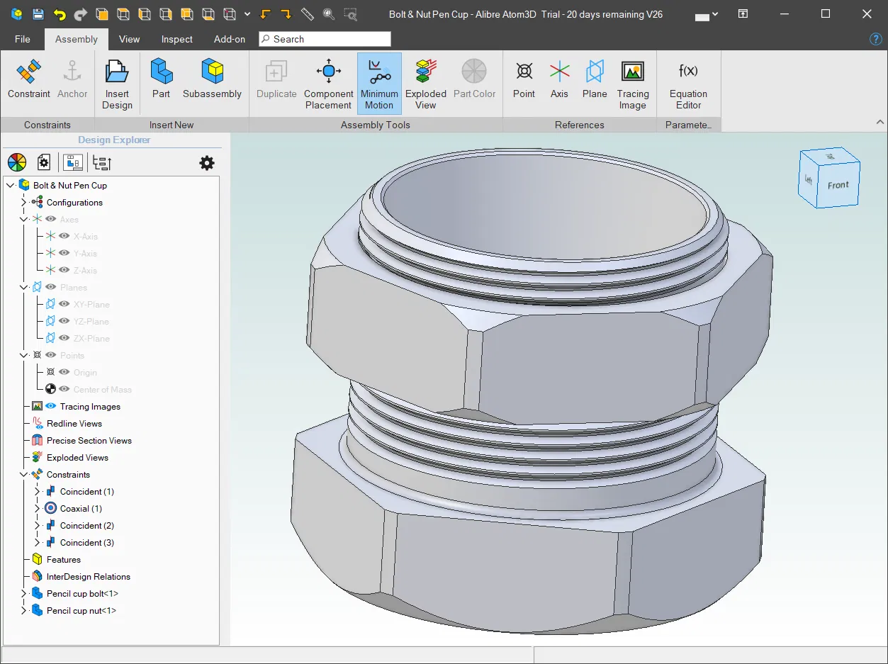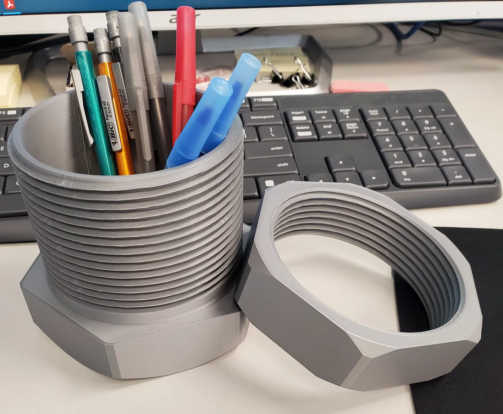 Ly cắm bút hình bu lông và đai ốc, thiết kế dành cho kỹ sư. Mô hình được tạo bằng Alibre Atom3D, sử dụng kích thước ren tiêu chuẩn 4-6 UN. Lưu ý dung sai ren khá khít, cần chạy thử để ren trơn tru hơn. Thoải mái tùy chỉnh theo ý bạn.