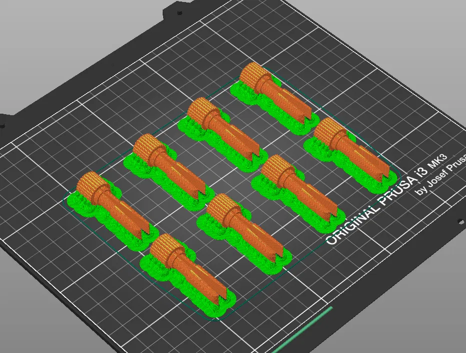 Sẽ in theo chiều dọc úp ngược như hình, nhưng nó dễ bị gãy ở điểm chuyển tiếp. Sẽ cứng cáp hơn nếu in theo chiều ngang như trong ảnh chụp màn hình slicer.
