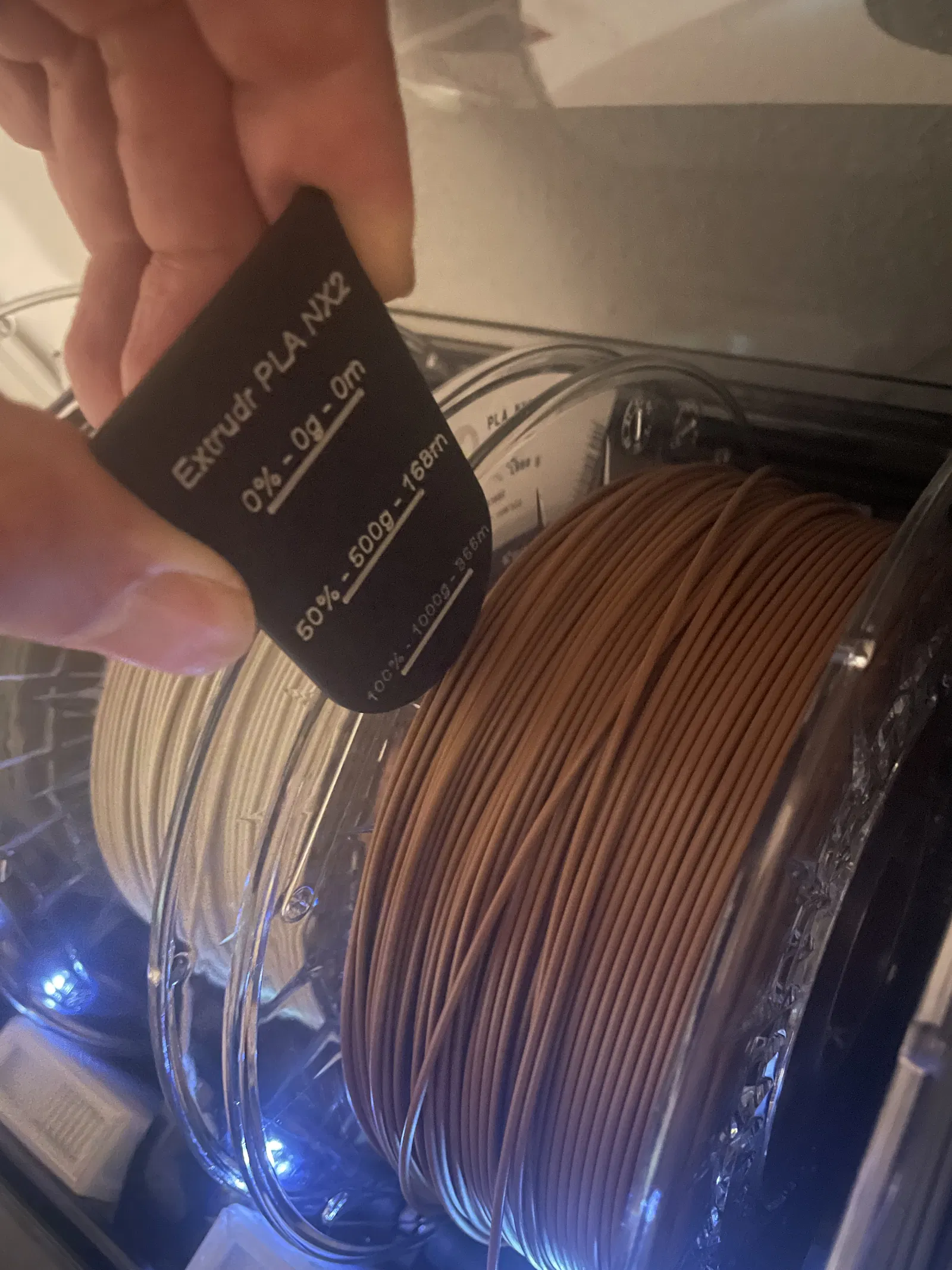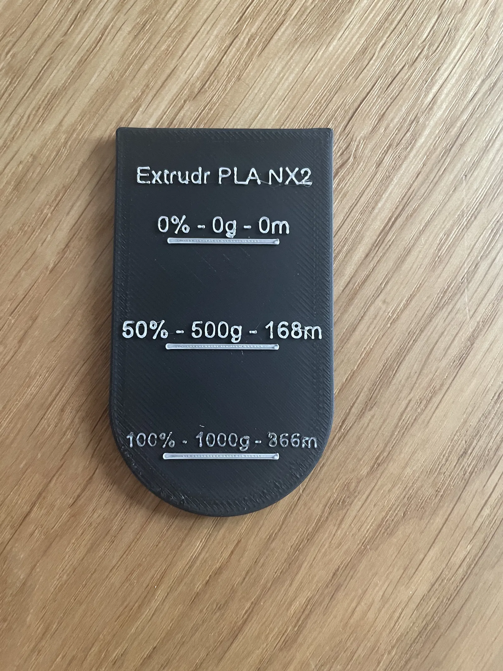 Cái kẹp này dùng cho cuộn chỉ filament Extrudr PLA 1,75mm NX2 (1kg). Nó hiển thị trọng lượng bằng kilogam và chiều dài bằng mét, được tính toán dựa trên mật độ vật liệu.