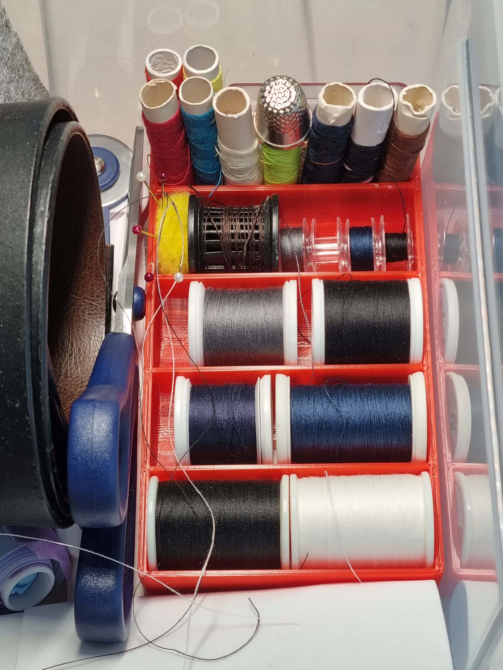 Khay đựng vài cuộn chỉ may và suốt chỉ.