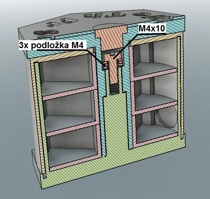 Nên in bộ phận "den.stl" với độ dày lớp là 0,1 (ren M4 bên trong). Tuy nhiên, bạn có thể cần phải chạy taro qua ren. Tùy thuộc vào độ chính xác in của máy in của bạn.
