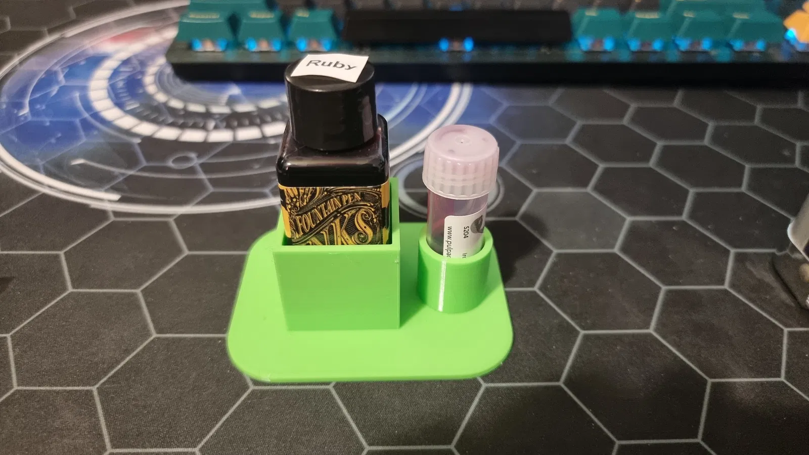 Lo đổ mực khi bơm cây bút máy? Tụi em có đế đựng chai Diamine 30ml hoặc lọ mực thử đường kính 17mm, đế bự chống lật, in nhanh gọn lẹ ở 0.2-0.3mm.