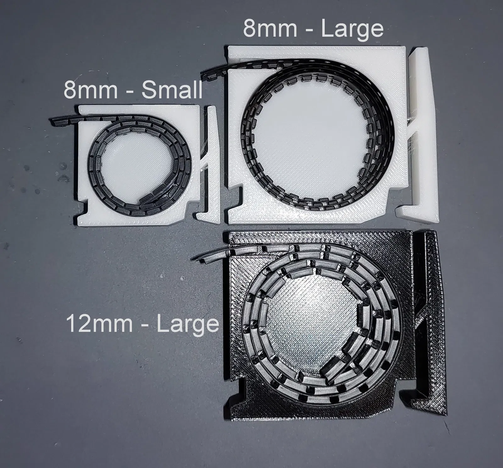Biến thể 8mm có hai kích cỡ, lớnnhỏ. Nhỏ là kích thước ban đầu, lớn là phiên bản phóng to 50% để chứa các cuộn băng dài hơn. Không có kích cỡ nhỏ cho biến thể 12mm vì dường như không cần thiết, nhưng nếu ai đó muốn, hãy cho tôi biết!