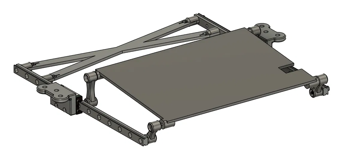 Cái "Tablet Slide" này có thể nhanh chóng và dễ dàng cất máy tính bảng dưới gầm bàn hoặc mặt bàn làm việc để tránh hư hỏng, nhưng cũng có thể kéo ra để sử dụng dễ dàng. Thiết kế sử dụng cơ cấu thanh giằng 4 thanh để xoay máy tính bảng từ hai vị trí ổn định, một vị trí để cất dưới mặt bàn, vị trí còn lại để dựng máy tính bảng ở một góc sử dụng được. Thanh trượt tuyến tính có thể hơi thừa thãi cho ứng dụng này, nhưng nó cung cấp một giá đỡ chắc chắn và mượt mà cho máy tính bảng.