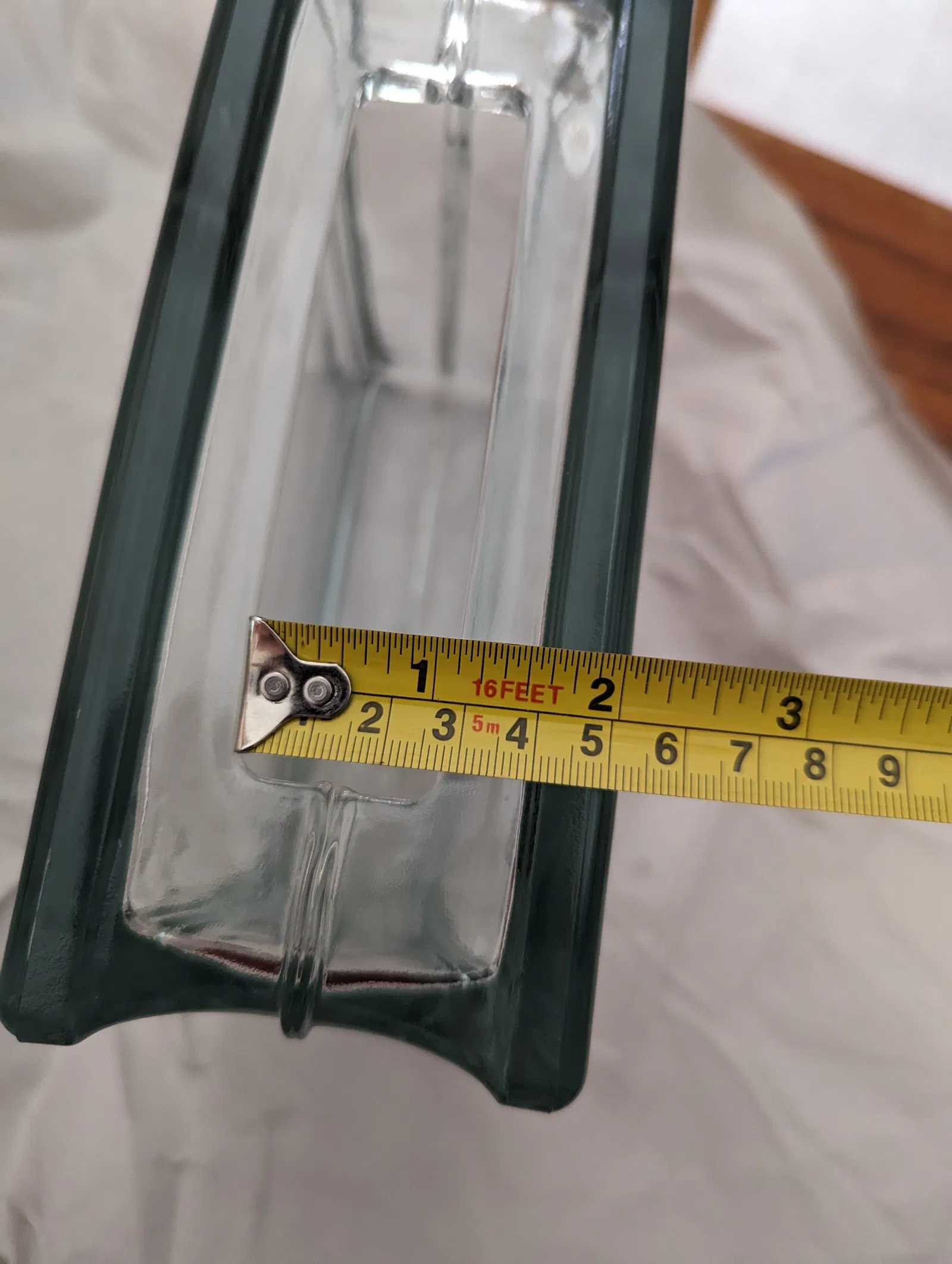 Cái lỗ hình chữ nhật trên khối thủy tinh có kích thước khoảng 108mm x 28mm (xem hình).