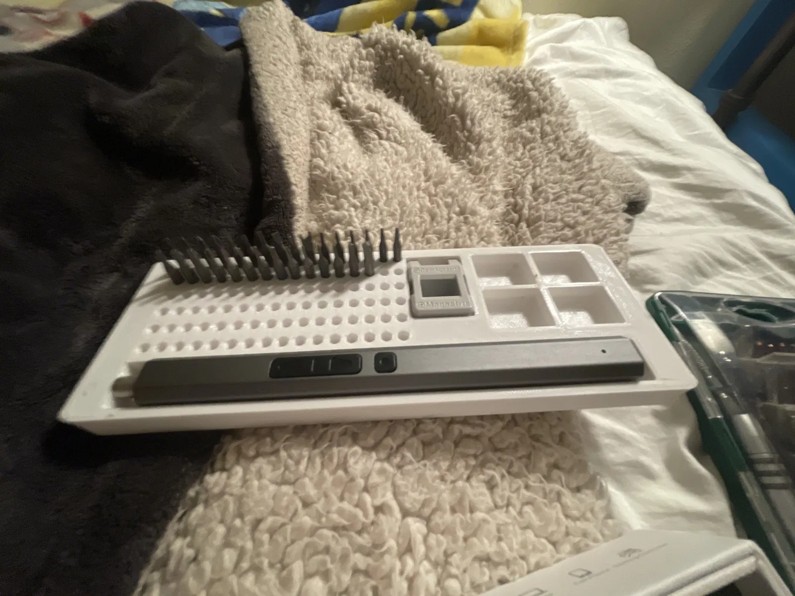 khay cho máy vặn vít điện temu, 4 hộp nhỏ cho ốc vít, chỗ để máy khử từ, khoảng 90 đầu vít vừa vặn trong các lỗ. in trên sv06 với klipper, không cần phóng to mô hình