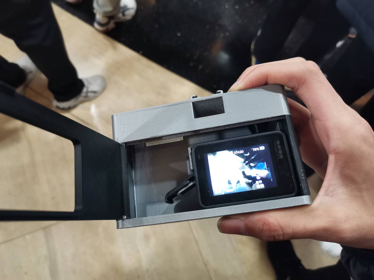 Nó làm cho chiếc GoPro của bạn trông giống như một chiếc máy ảnh phim vậy đó. Bạn cần 2 con ốc M3 làm trục cho cửa sau nha. Cần hỗ trợ.