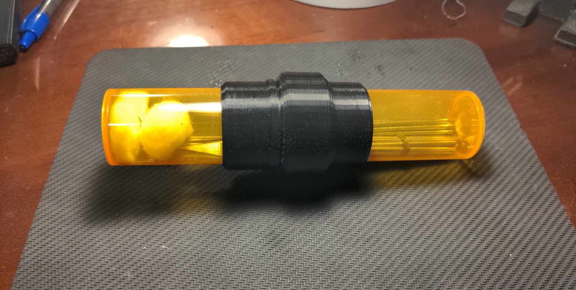 Tao có cây súng thổi tên Tim Wells, mà tao lại có cả đống vỏ chai thuốc hết hạn. Thế là tao chế ra cái này để đựng tên cho súng, hai mảnh khớp chặt với hai chai thuốc có đường kính miệng khoảng 35mm.