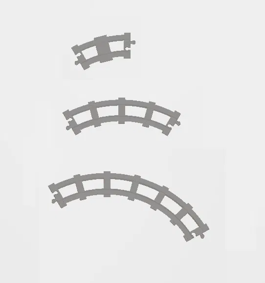 Đường ray thẳng dài 25cm 38cm, Ngã tư, đường cong 30, 60, 90 độ. Thông tin cho bản in 3D: chiều cao lớp 0,5mm và mật độ điền đầy từ 10-20%.