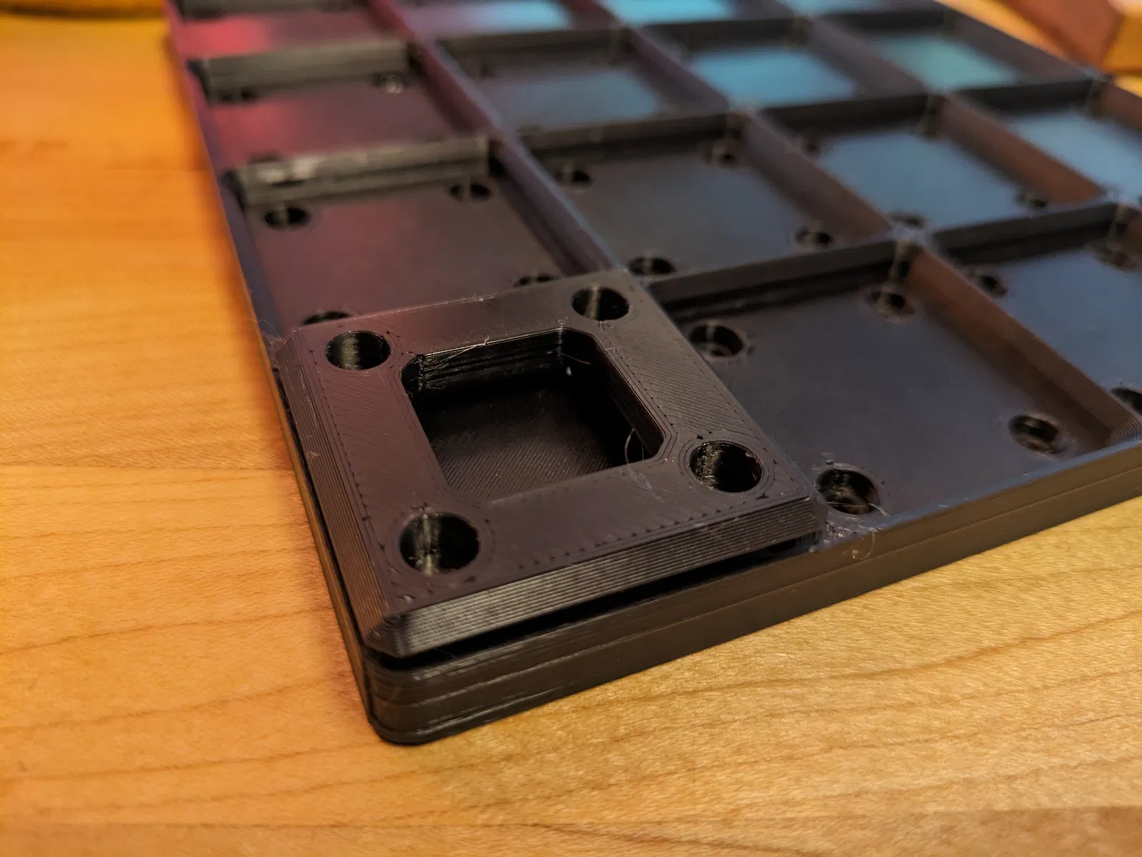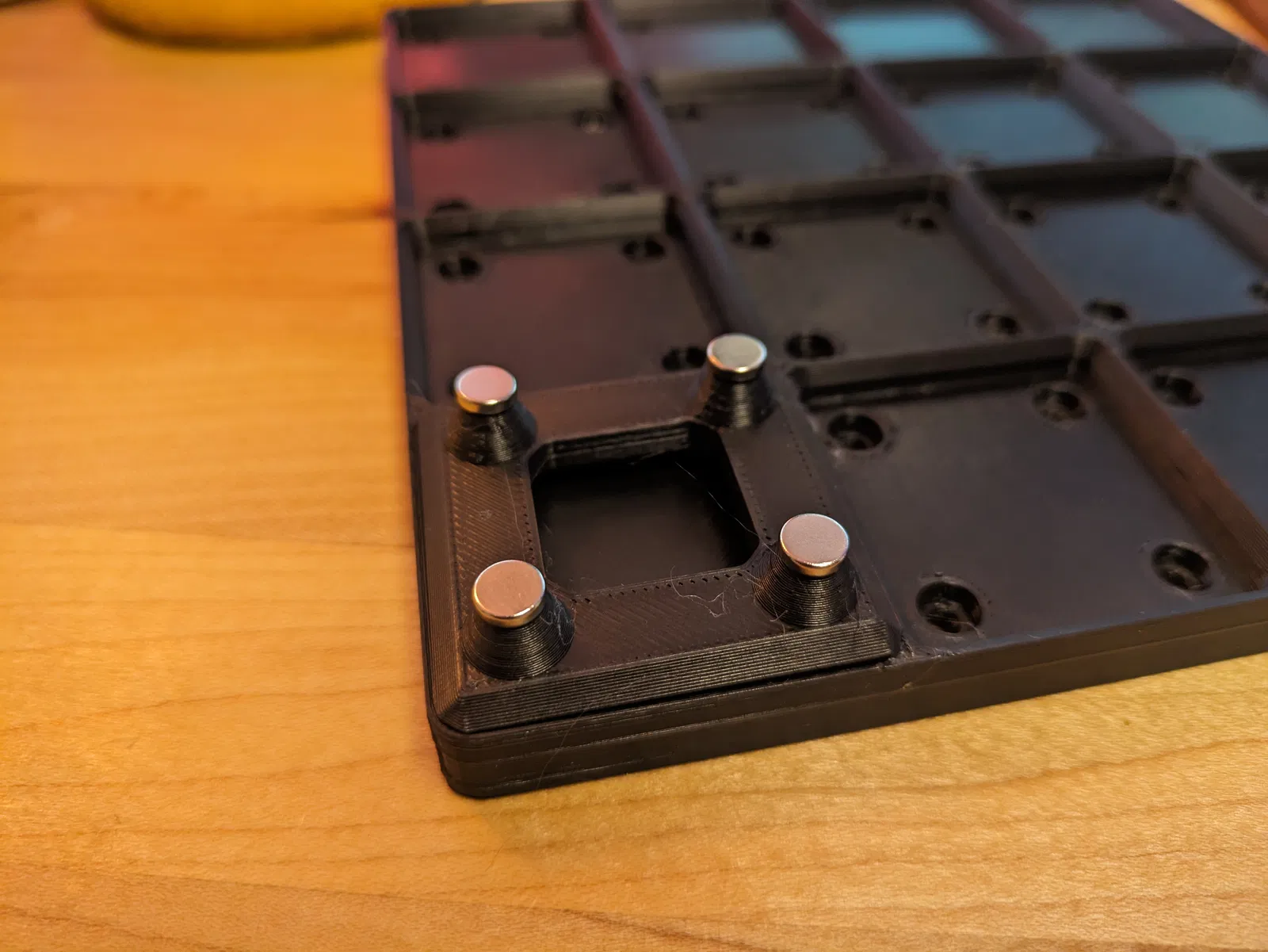 Phía dưới có mấy cái lỗ để nhét nam châm 6x2mm vô, hoặc bạn có thể gắn nam châm vô 4 cái trụ này. Tui in mấy cái khuôn này để đứng nguyên cái đế Gridfinity lên trên rồi gắn cả đống nam châm cùng lúc.