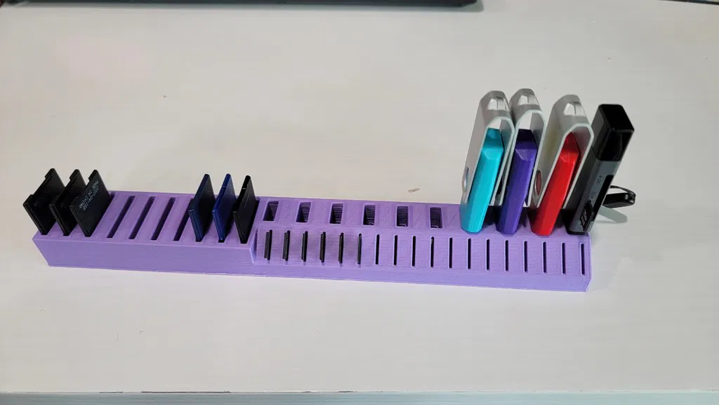 Phiên bản lớn hơn của giá đỡ USB, thẻ SD và MicroSD của Lalo_Salo. Sản phẩm này có thể đặt vừa vặn trong ngăn kéo bàn làm việc, hoặc bạn có thể gắn thêm đế để trưng bày trên bàn.