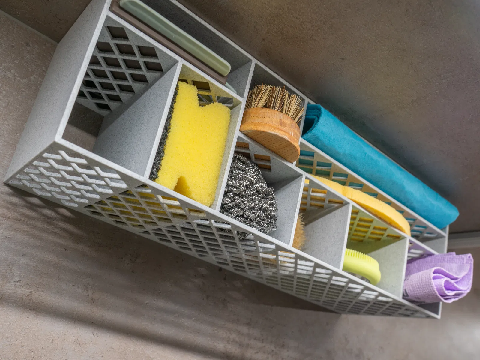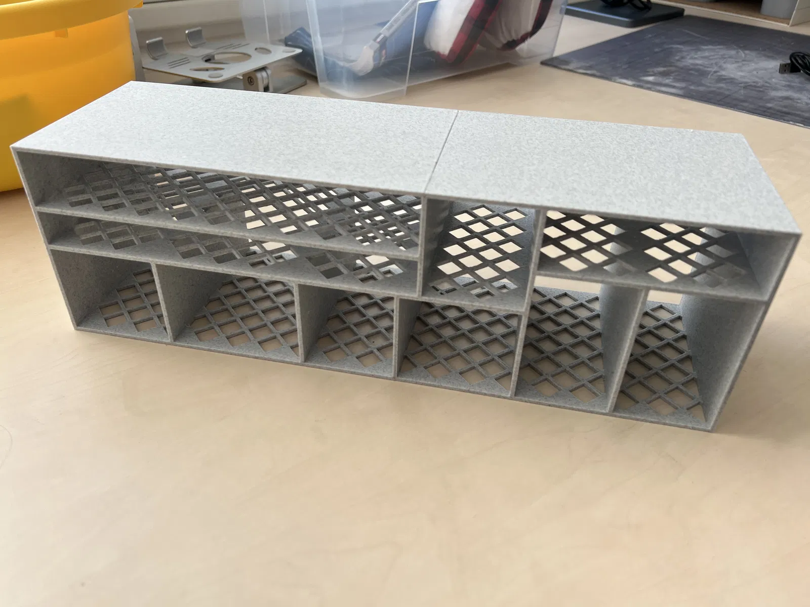 Khay đựng đồ dùng dưới bồn rửa chén, được chia làm hai phần để in vừa bàn in MK4. In bằng PLA, không cần support nhưng cần dán.