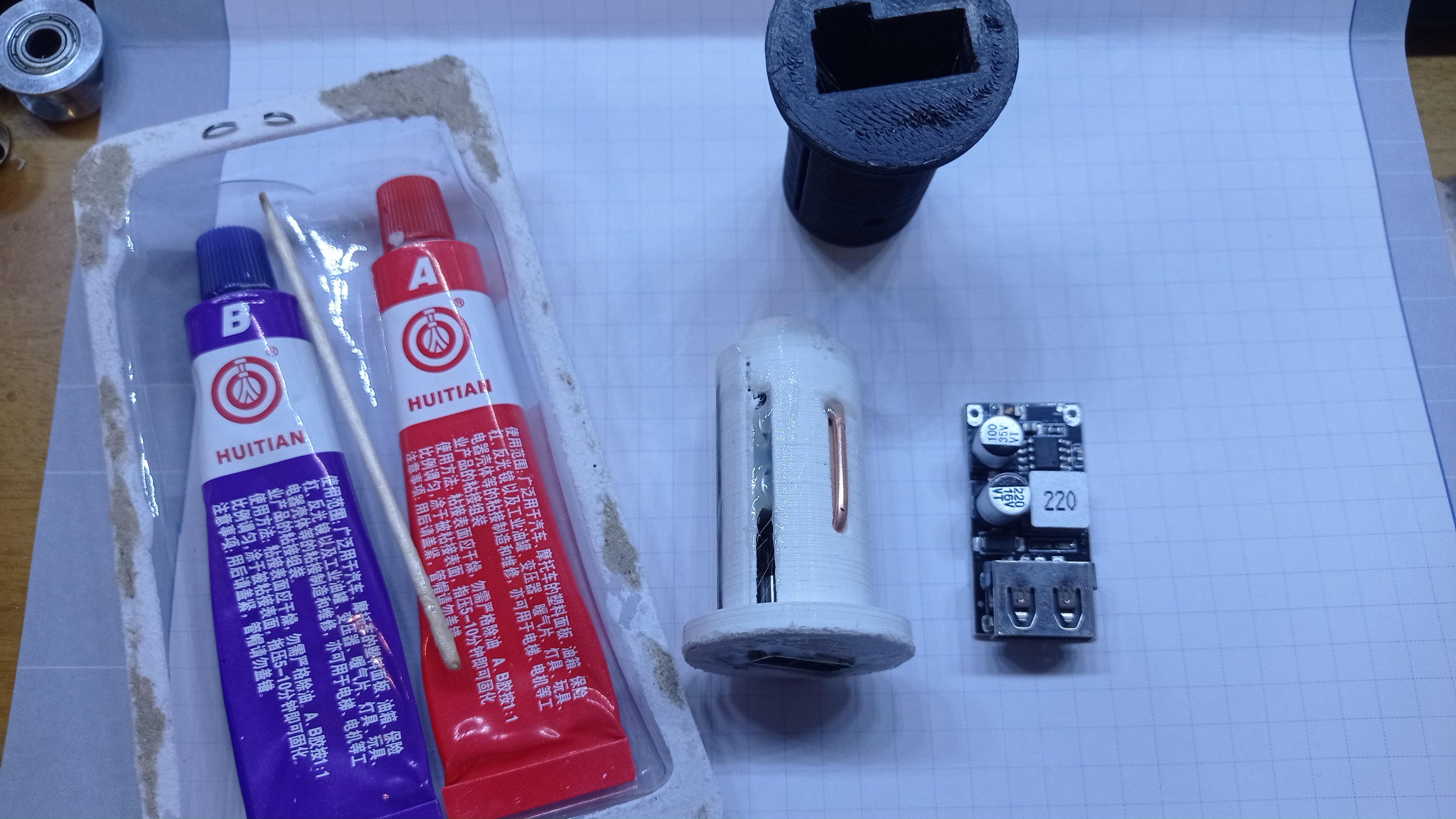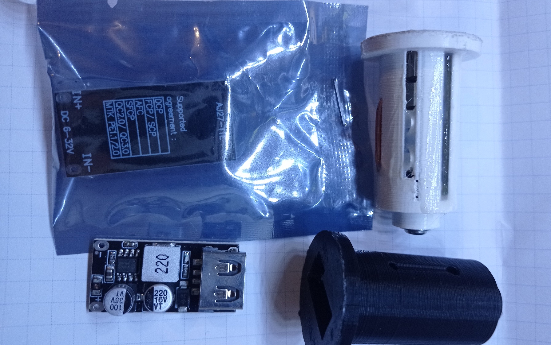 Mô hình sạc xe hơi USB đơn giản, gắn vừa tẩu thuốc. Sử dụng mô-đun hạ áp DC-DC HW-298, kích thước nhỏ gọn, chỉ cần ốc, dây và keo epoxy. Hoàn toàn tạo bằng PrusaSlicer.