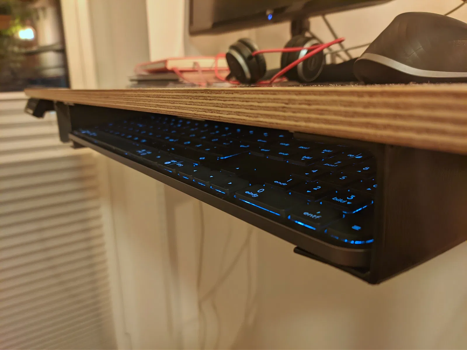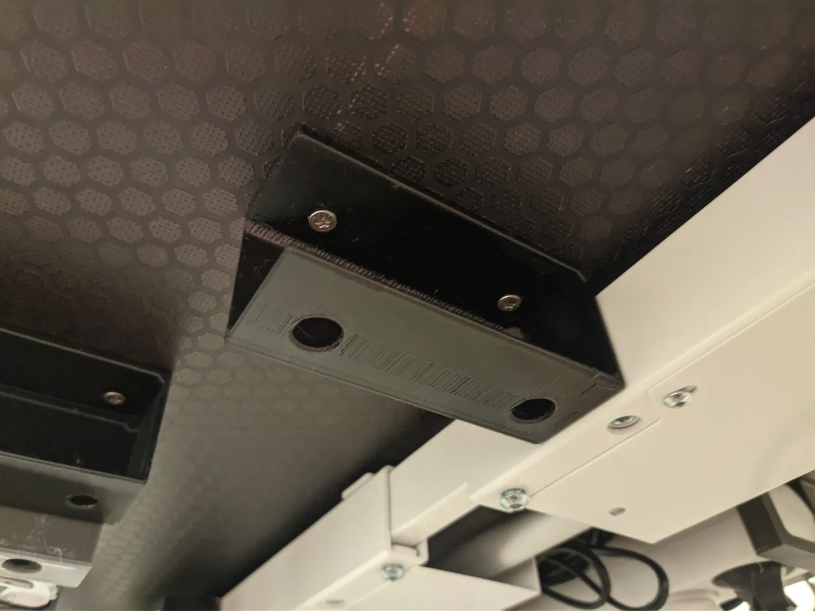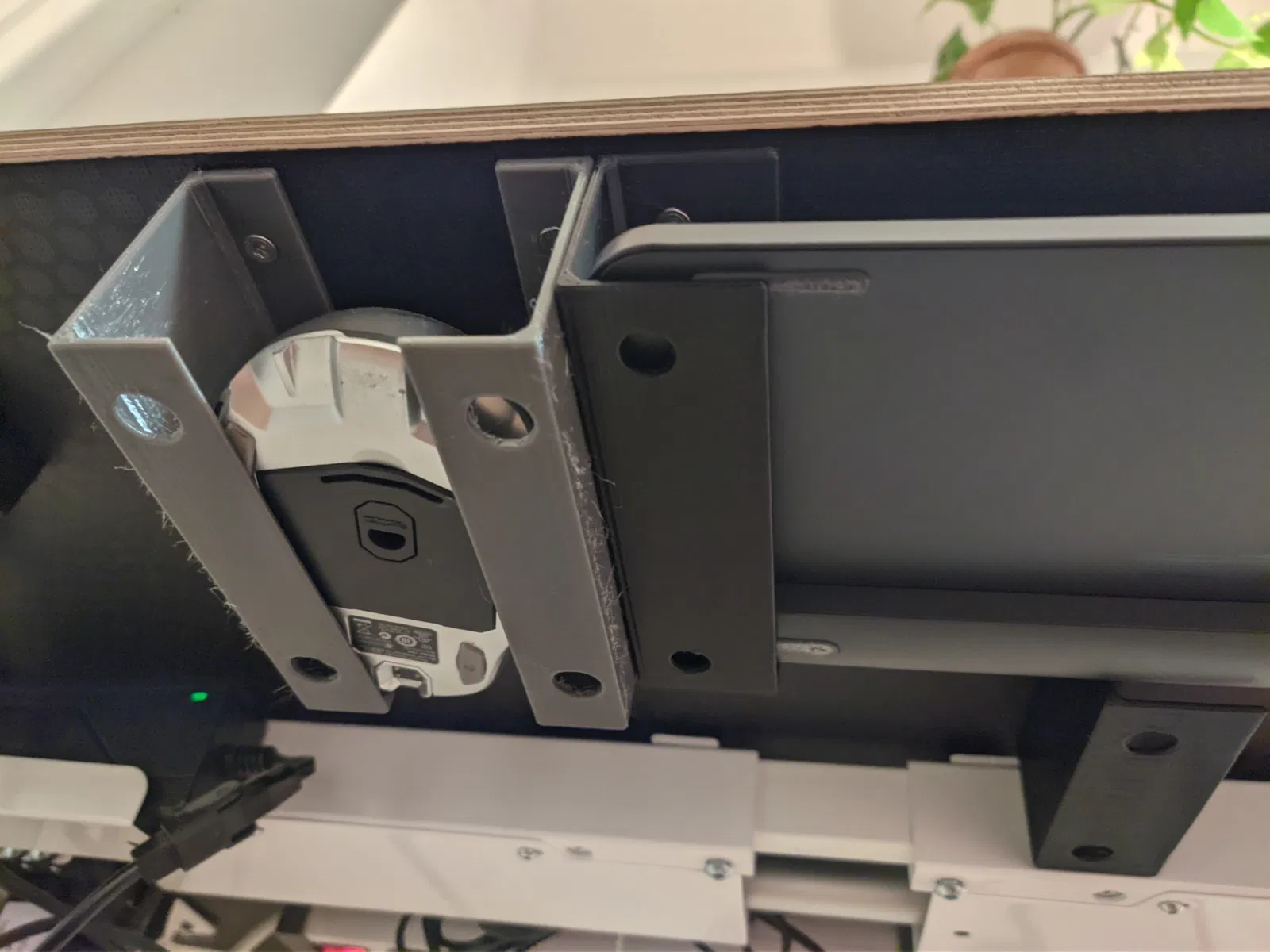 Tôi thiết kế cái bracket này để cất bàn phím dưới gầm bàn khi không dùng tới. Nó chỉ cần trượt vào các khe của bracket thôi. Mỗi bracket được cố định bằng hai con vít, còn lỗ ở dưới đáy giúp dễ dàng thao tác với chúng. Tôi khuyên bạn nên in đủ lớn cho cái đầu giữ mũi khoan của máy khoan điện nhà bạn.