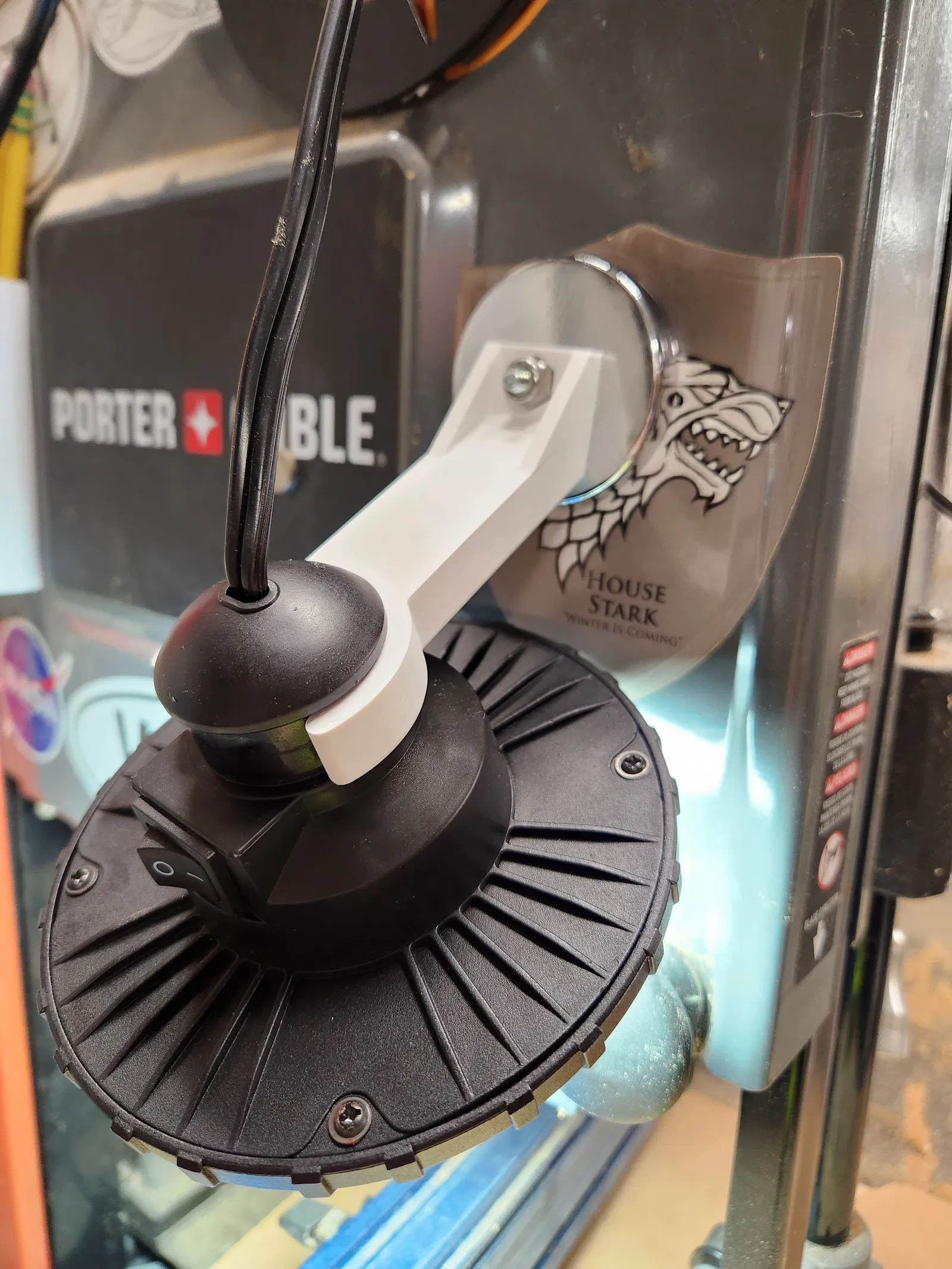 Chân đế thay thế cho đèn kẹp Braun 800 lumen của Harbor Freight. Chiếc đèn này xài rất tốt nhưng chân đế gốc hơi lỏng lẻo, dễ xê dịch. Thiết kế mới này gắn chắc chắn vào đèn và có thể bắt ốc vào đế nam châm 25lb của Harbor Freight.
