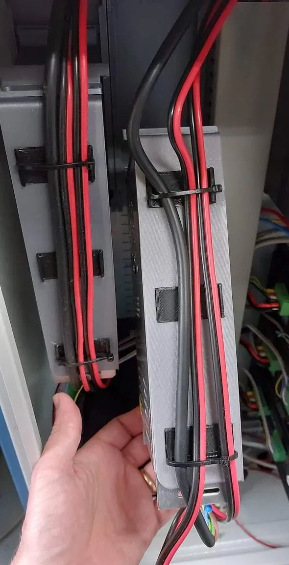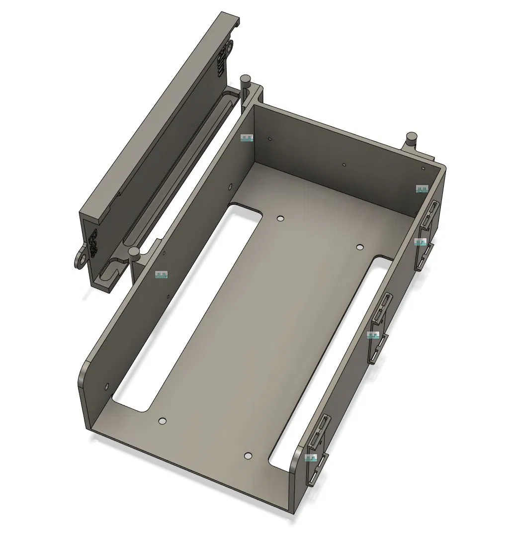 Hộc đựng nguồn có bản lề, dùng để đỡ nguồn điện 220V 12V. Thiết kế bản lề giúp đi dây ngang dễ dàng và dựng nguồn dọc tiết kiệm không gian tủ điện. Khuyến nghị in với lớp 0.3mm, 20% Infill.