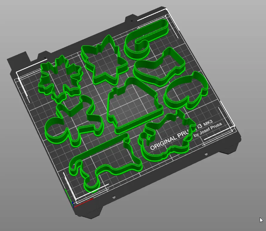 Bộ 9 khuôn cắt bánh quy Giáng Sinh độc đáo, bao gồm nhiều hình dạng như Người Gừng, tuần lộc, găng tay, nhà, vớ Giáng Sinh, kẹo mút, Ông Già Noel, xe trượt tuyết, bông tuyết và ngôi sao. Kích thước khoảng 85mm, có thể tùy chỉnh dễ dàng trong Fusion 360. In bằng PETG với cài đặt tối ưu.