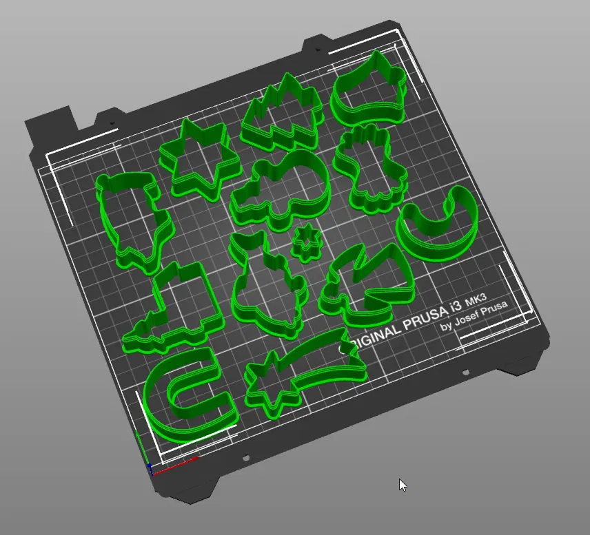 Bộ 13 dao cắt bánh quy, bánh gừng Giáng Sinh bao gồm các hình: thiên thần, chuông, nơ, cá chép, cá, sao chổi, sao băng, móng ngựa, cây thông, nhà thờ, heo, bánh sừng bò, người tuyết, ngôi sao. Kích thước khoảng 50mm, có thể tùy chỉnh dễ dàng trong Fusion 360. In bằng PETG với thông số tối ưu.