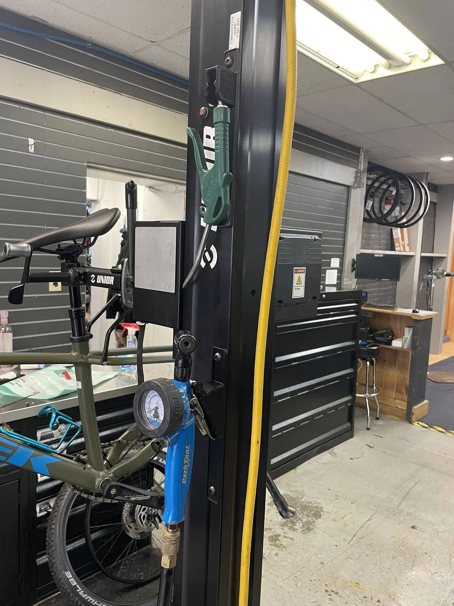 Chỉnh sửa để gắn máy bơm hơi Park vào chân đế nâng xe đạp điện Unior. Khá tự giải thích. Có thể sử dụng phần cứng trên chân đế. Dành cho người dùng Parktool và Unior.