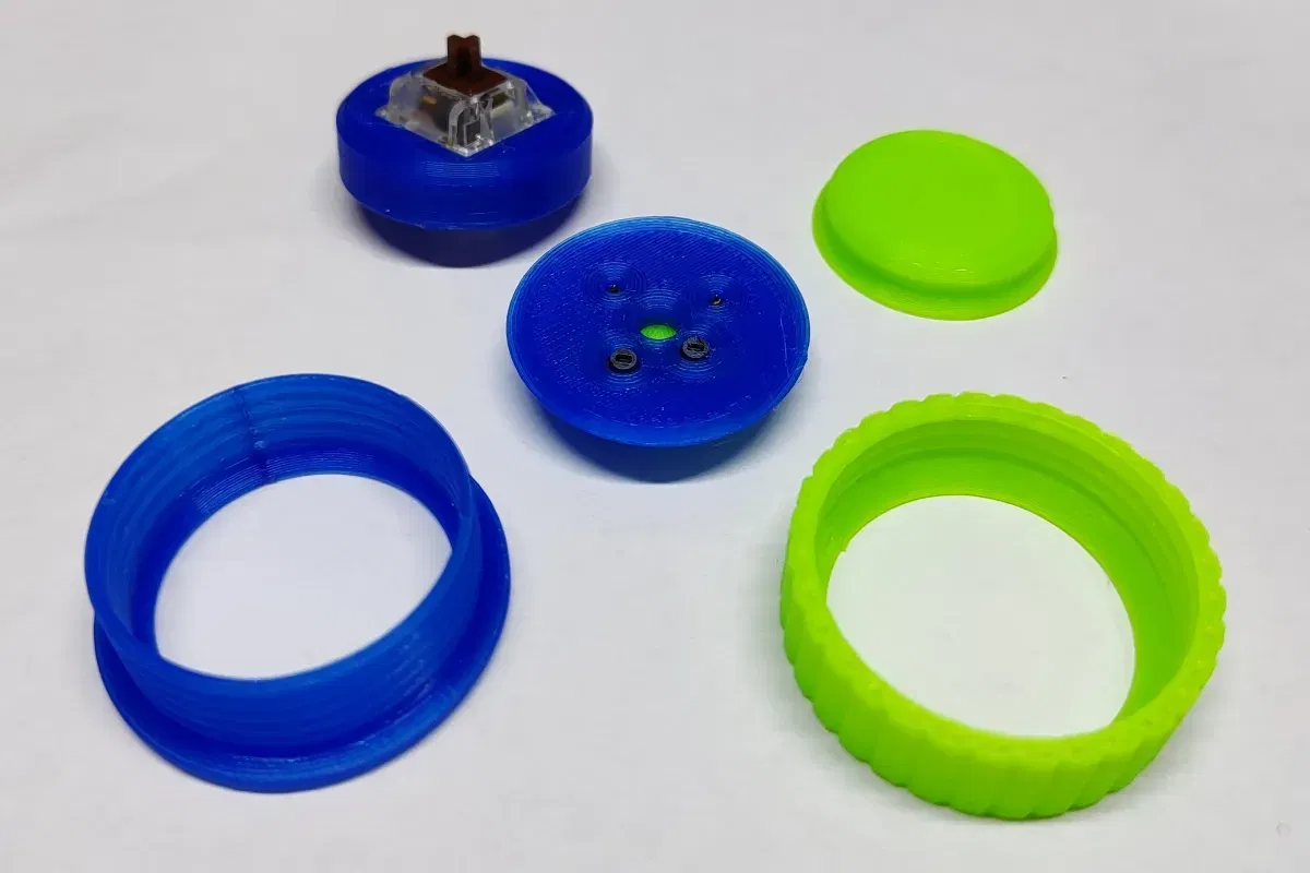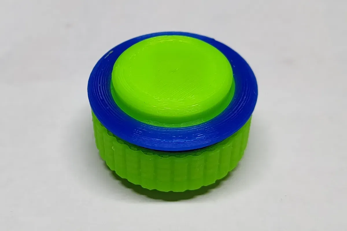 Hầu hết các nút bấm arcade in 3D dường như dựa vào một thiết kế mà nắp nút chỉ được giữ cố định bởi thân mà đầu nối hình chữ thập của công tắc trượt vào và được giữ ở đó chỉ bằng ma sát. Tôi không thích thiết kế này vì do hình dạng của đầu nối, thân phải được in theo một hướng không tốt dẫn đến một mảnh khá yếu do các đường lớp. Ngoài ra, cũng khá khó để có được các kích thước chính xác để nắp giữ cố định trong quá trình chơi game gay gắt.