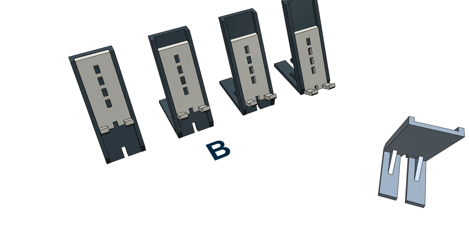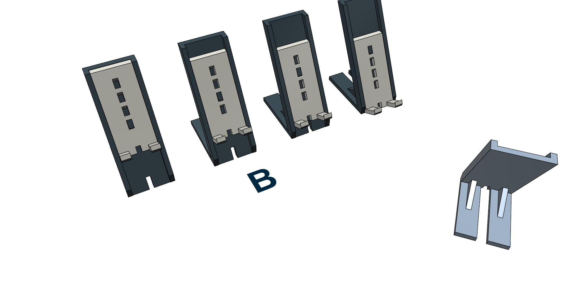 B. Phiên bản chân đế điện thoại dài hơn có móc giữ cho điện thoại kèm ốp lưng. Phiên bản dài hơn thì vững hơn. Kích thước khoảng 70 x 50(rộng) x 115(cao)mm. Dễ in mà không cần support. Có thể in mà không cần support, vì góc nghiêng tối đa là 45°. Bạn có thể dùng sợi PLA, nhiệt độ 205°C-55°C, độ dày lớp 0.3mm cho lớp đầu tiên và 0.15mm cho các lớp còn lại.