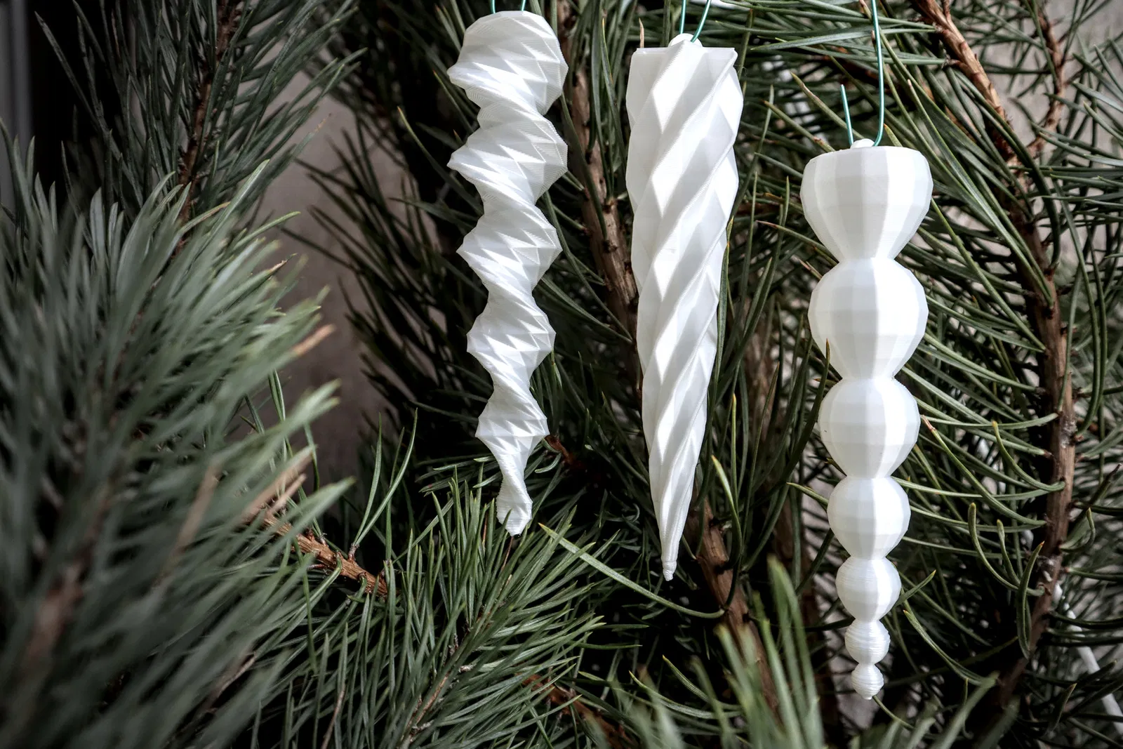 Tập hợp các mẫu icicle (thạch nhũ băng) để trang trí cây thông Noel, bạn có thể in chế độ vase mode và luồn dây treo qua các lỗ có sẵn. Chất liệu gợi ý là PLA Pearl White cho vẻ lung linh.