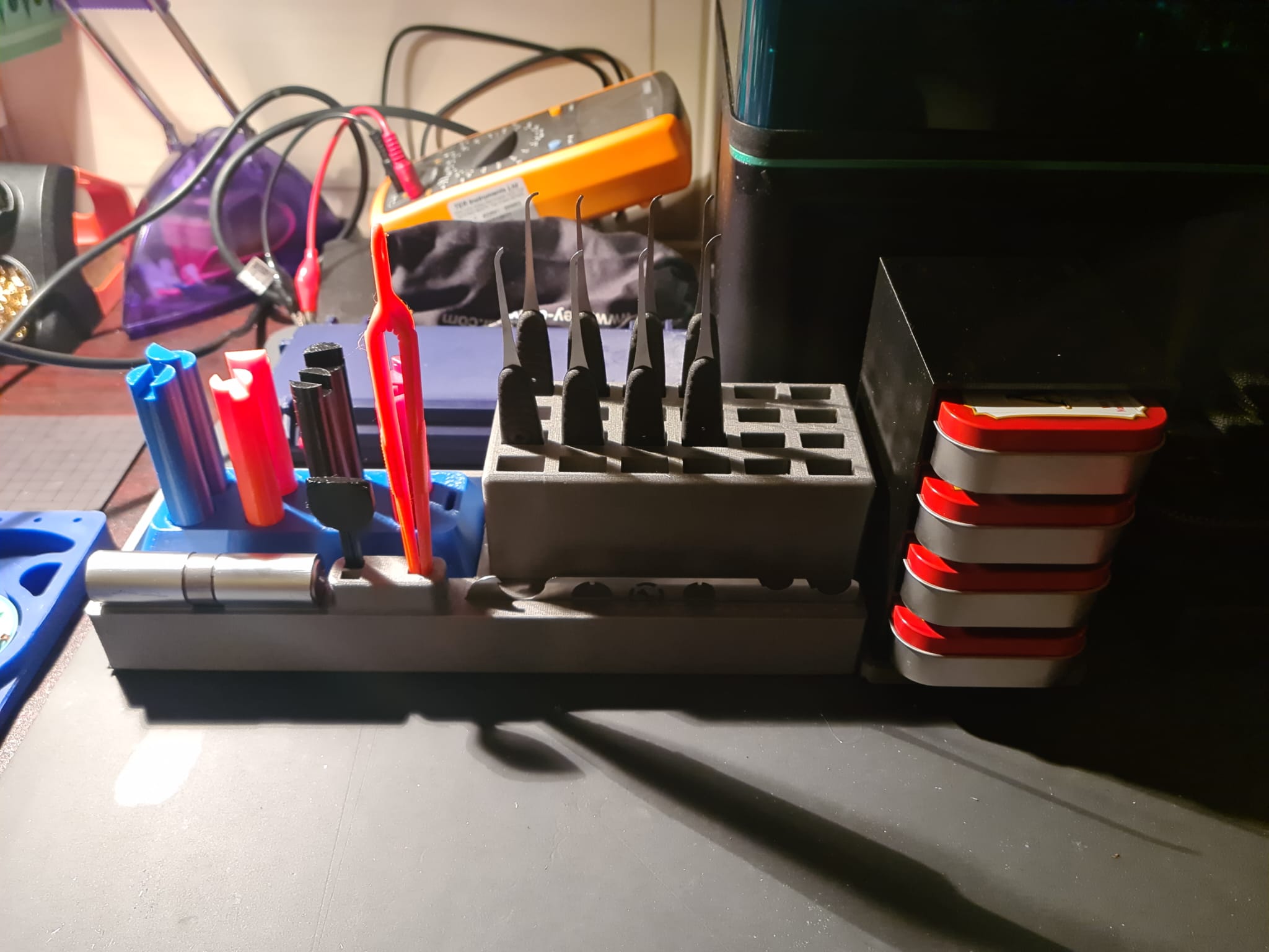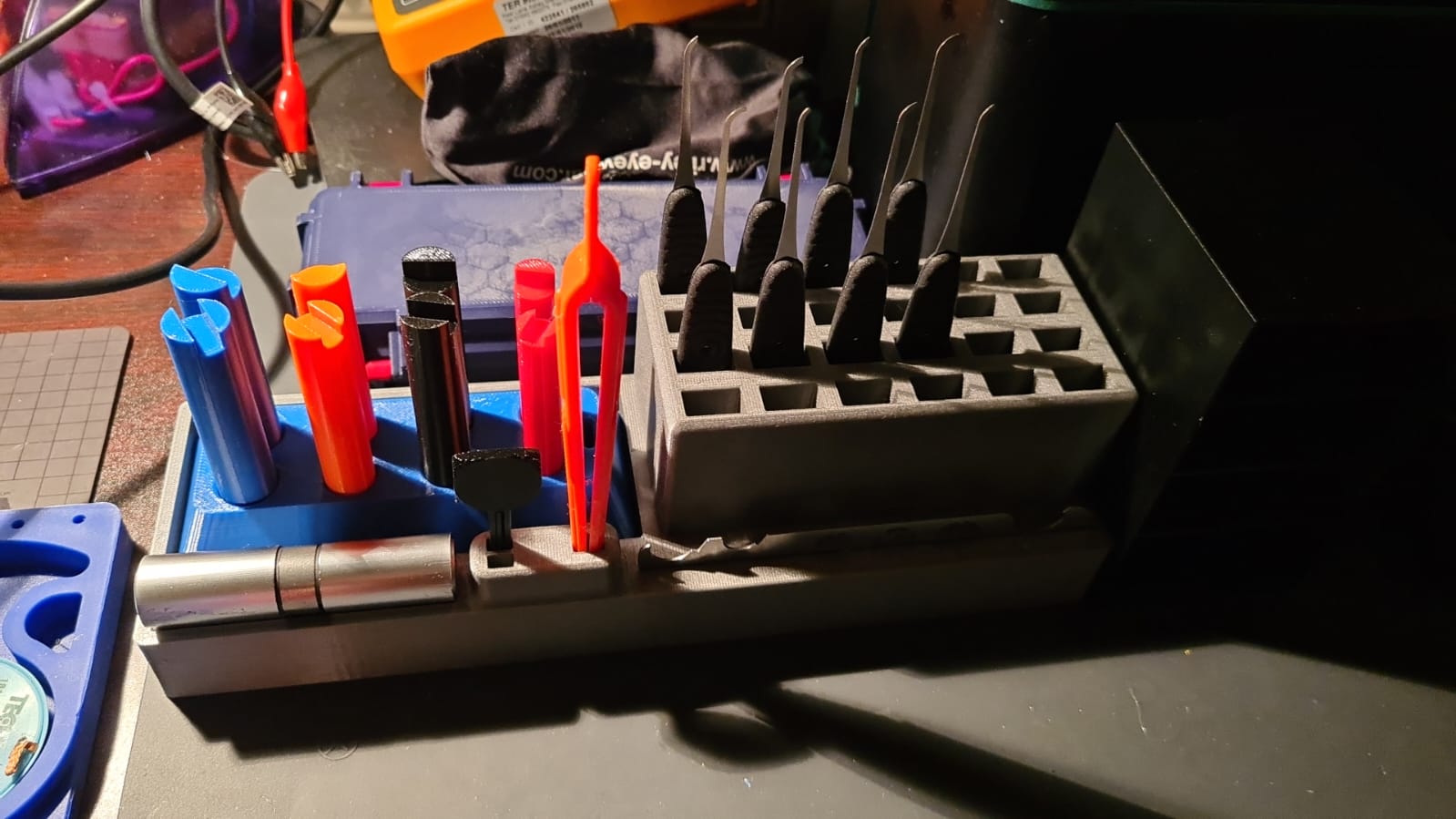 Tui cần một cái giá để giữ mấy món đồ lặt vặt khi rọc khóa và cả móc khóa nữa. Cái này có chỗ để plug follower, ổ khóa euro, dụng cụ xoay disc detainer, nhíp gắp chốt, dụng cụ cắt Sparrows, và cả lockpick nữa. Có cả bệ phụ để chứa đồ dự phòng.