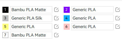 The printing is done with a single AMS. I have added a pause before the fifth color and have arranged the fifth to seventh colors in the spaces, 4th, 3rd and 1st of the AMS, in that order (I attach photos for clarity).