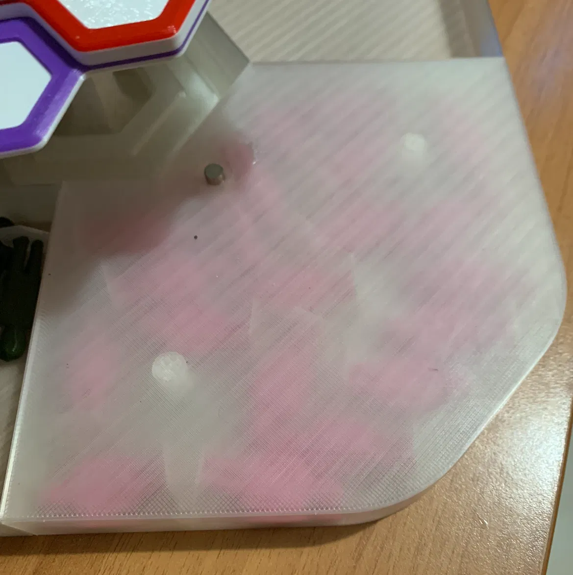Để gắn nam châm, tôi khuyên bạn nên lắp tất cả các nam châm trên nắp trước, và tận dụng lực hút của chúng, gắn thêm một viên nam châm khác vào mỗi viên nam châm để đảm bảo đúng chiều. Khi đã xong với nắp đậy ở đúng vị trí trên đế, hãy ấn nam châm vào đúng vị trí, những viên nam châm cần dán keo là những viên của bộ phận trò chơi, trong bản remix của tôi có một lỗ giả cho bạn biết vị trí chính xác của nam châm, nếu bạn đã in từ mẫu gốc, chỉ cần gắn 4 nam châm vào nắp và dùng keo dán trang trí, thêm một giọt vào mỗi viên, cuối cùng đặt bộ phận trò chơi vào và chờ khô. Cuối cùng, lắp 2 nam châm còn lại vào các bộ phận Đế A và B, và vặn 2 vít M3x16 vào tay cầm.